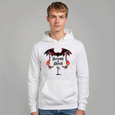 Show your metal spirit with this unisex premium pullover hoodie featuring the bold ‘Scream & Shred’ design: a blood-dripping bat, flaming chains, pentagrams, and a skull mic stand. Made for comfort and style, perfect for concerts, festivals, or everyday wear. Soft, durable fabric—no certifications claimed.