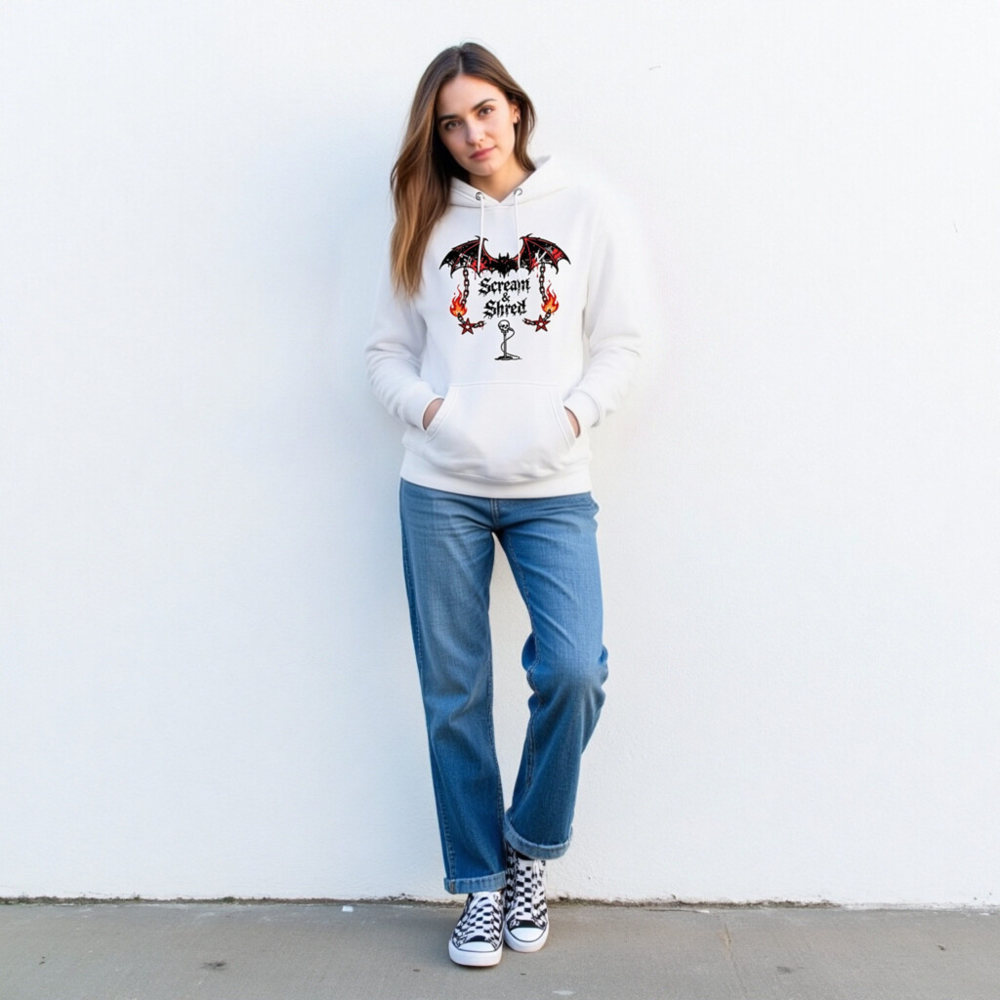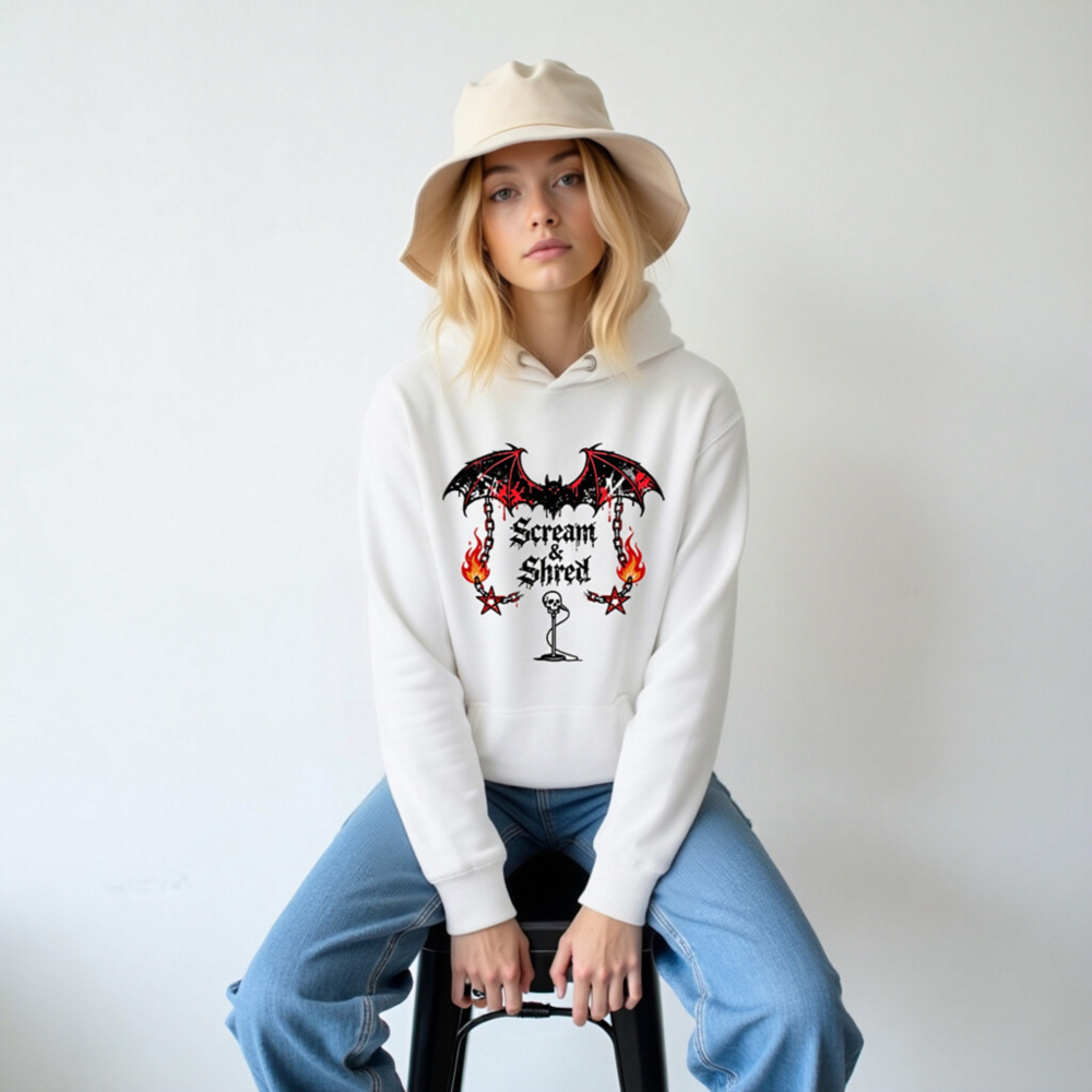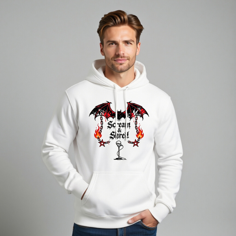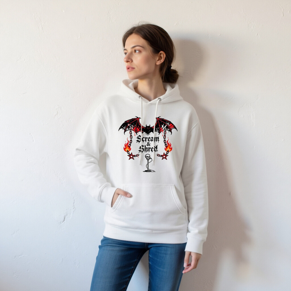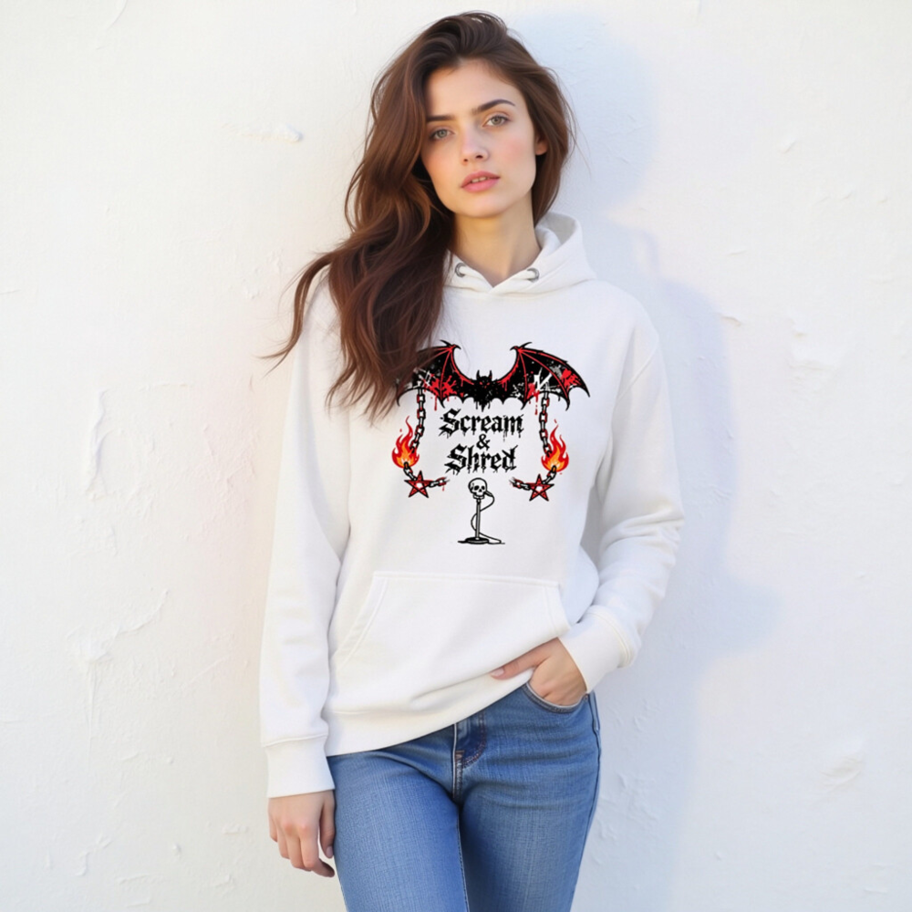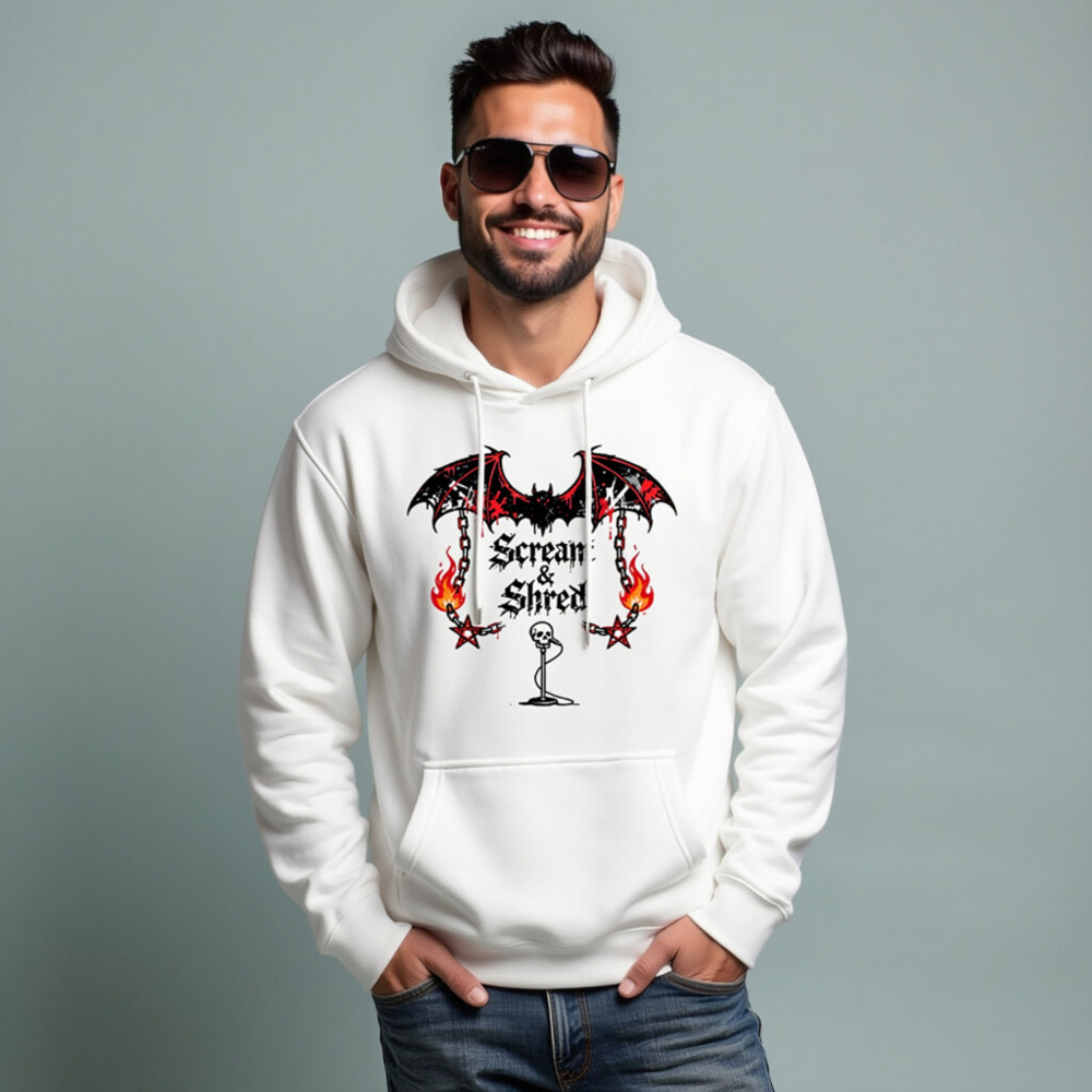 Show your metal spirit with this unisex premium pullover hoodie featuring the bold ‘Scream & Shred’ design: a blood-dripping bat, flaming chains, pentagrams, and a skull mic stand. Made for comfort and style, perfect for concerts, festivals, or everyday wear. Soft, durable fabric—no certifications claimed.