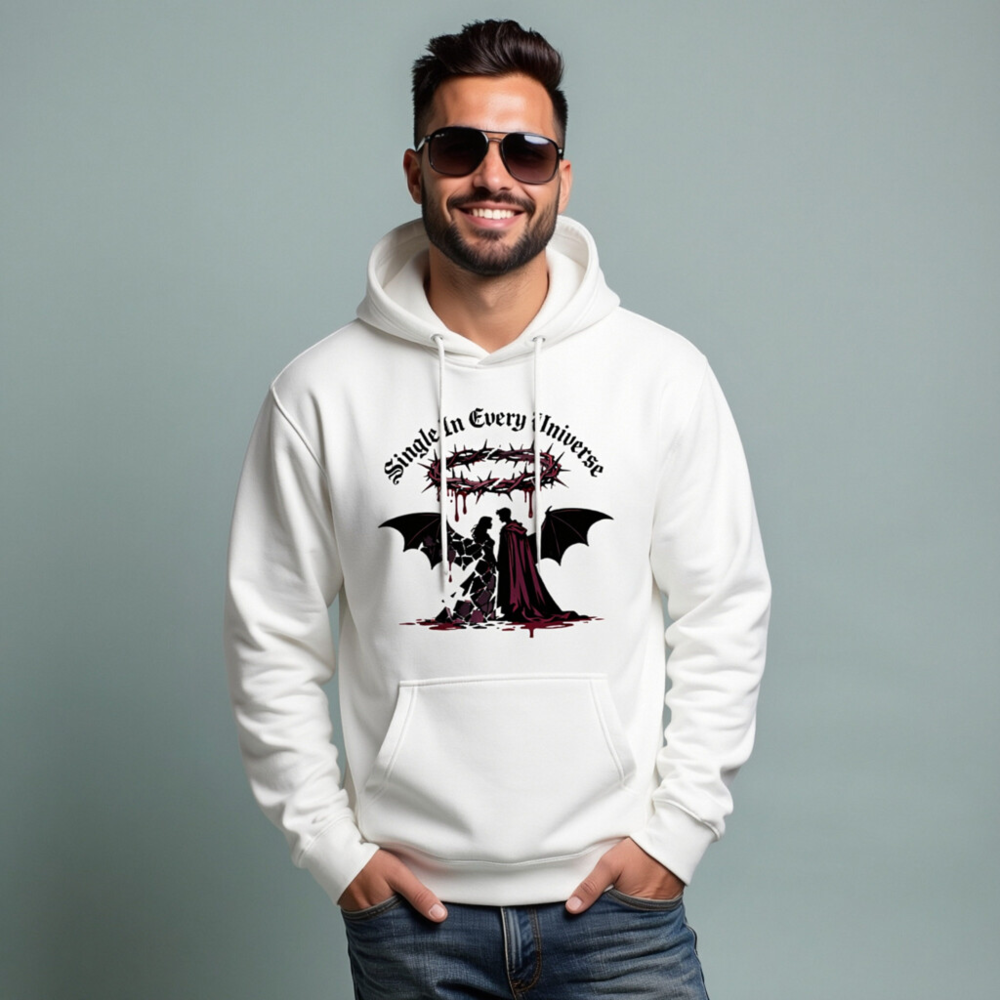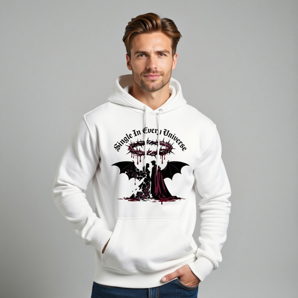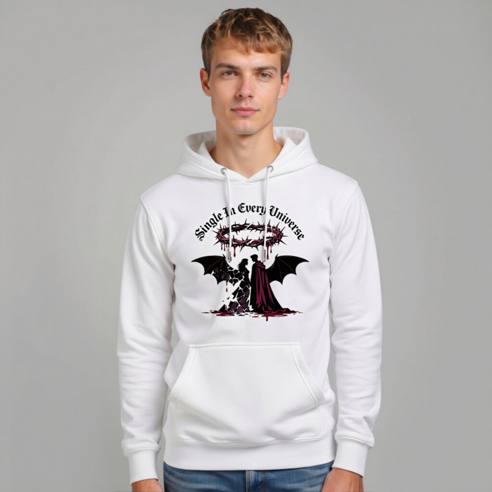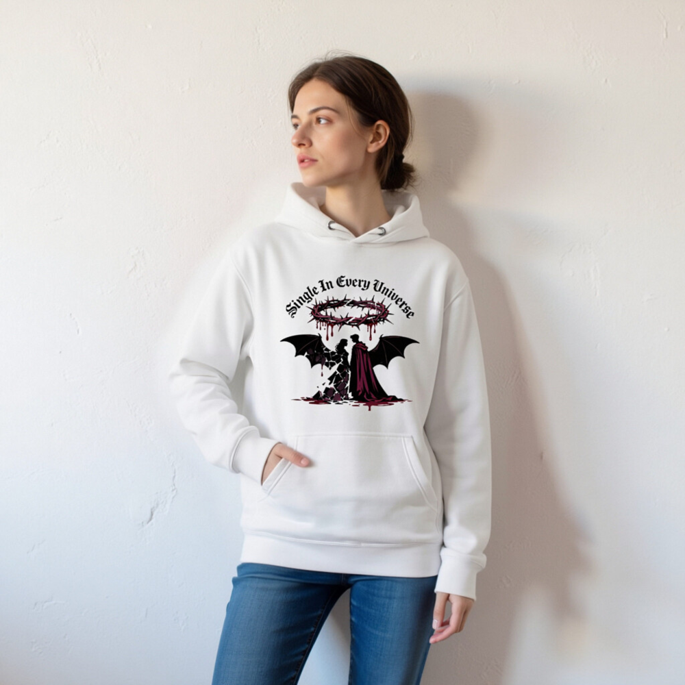 Wear the bold statement ‘Single In Every Universe’ with this unisex premium pullover hoodie. Featuring a striking gothic design: a crowned devil and angel silhouette, blood-dripping crown, and dramatic wings—perfect for dark romance or alternative fashion lovers. Soft, comfortable, and stylish—ideal for everyday wear or special occasions.