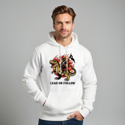 Show your bold leadership with this unisex premium pullover hoodie featuring a striking vintage-style graphic: a cat in military regalia riding a roaring T-Rex amid flames, holding a black flag with white star. The bold ‘LEAD OR FOLLOW’ slogan empowers wearers to embrace authority or inspire others. Made for comfort and style—perfect for fans of retro warrior aesthetics and fearless self-expression.