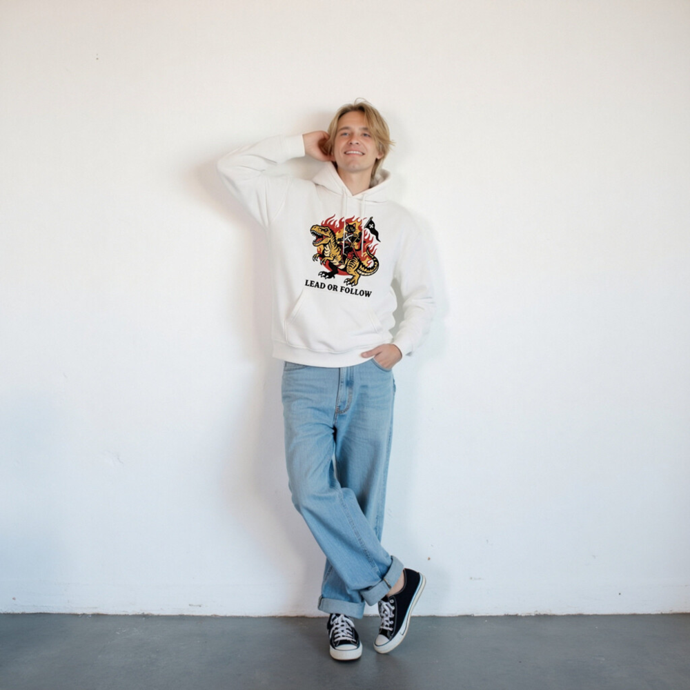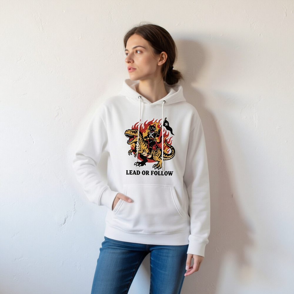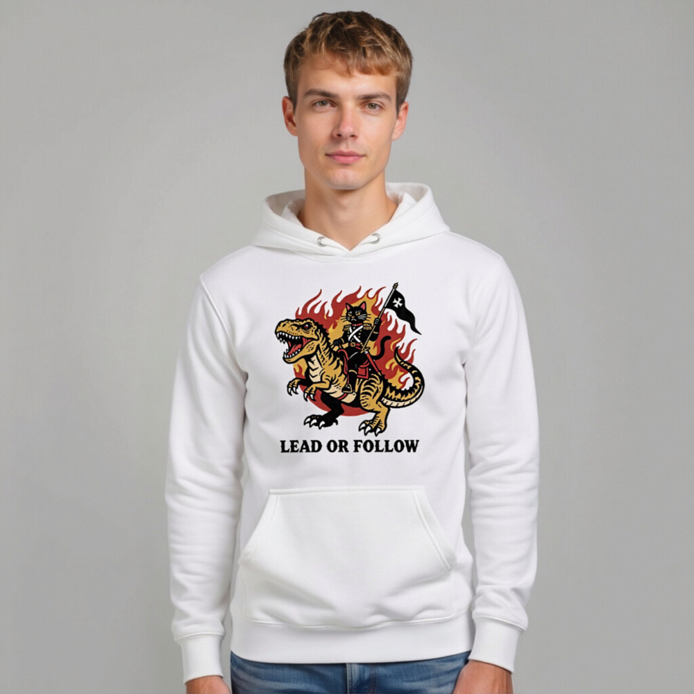 Show your bold leadership with this unisex premium pullover hoodie featuring a striking vintage-style graphic: a cat in military regalia riding a roaring T-Rex amid flames, holding a black flag with white star. The bold ‘LEAD OR FOLLOW’ slogan empowers wearers to embrace authority or inspire others. Made for comfort and style—perfect for fans of retro warrior aesthetics and fearless self-expression.