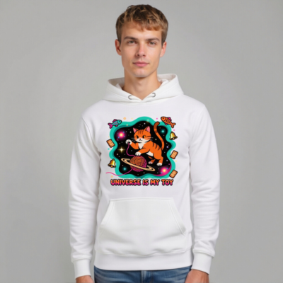 A playful unisex premium pullover hoodie featuring a vibrant ‘Universe Is My Toy’ design: an orange tabby cat weaving cosmic yarn with planets, fish, bells, and treats against a starry nebula. Soft, comfortable fit for everyday wear. Ideal gift for cat lovers and space enthusiasts. Designed for all genders—versatile, stylish, and fun.