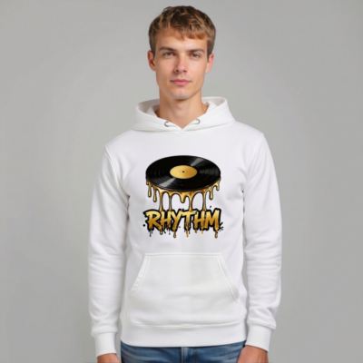 Wear the rhythm—this unisex premium pullover hoodie features a striking vinyl record with golden drip art and bold ‘RHYTHM’ typography. Made for comfort and style, it’s perfect for music lovers and fashion-forward individuals. Soft cotton blend, classic fit, versatile for everyday wear. The design captures the energy of analog music culture with modern streetwear flair.