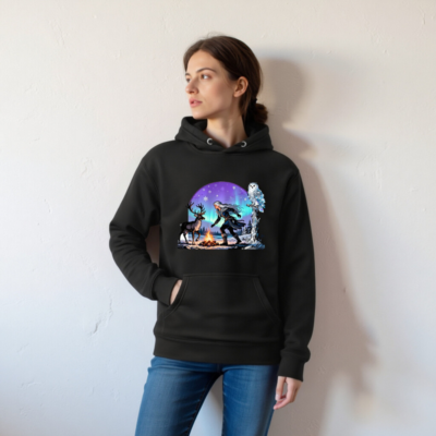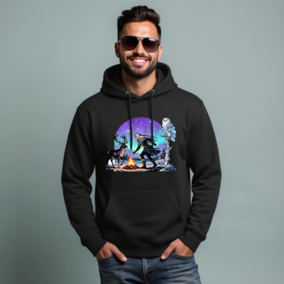 This unisex premium pullover hoodie features a magical winter scene: a silver-haired witch, a reindeer, and a snowy owl beside a campfire under the aurora borealis. Made for comfort and style, this cozy black hoodie is perfect for cold seasons. The vivid, high-resolution print captures the enchanting Nordic fantasy aesthetic—ideal for fans of folklore, nature, and mystical themes.
