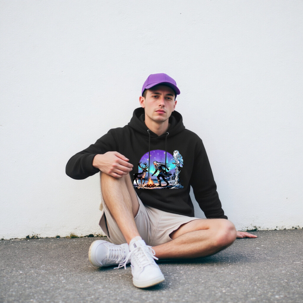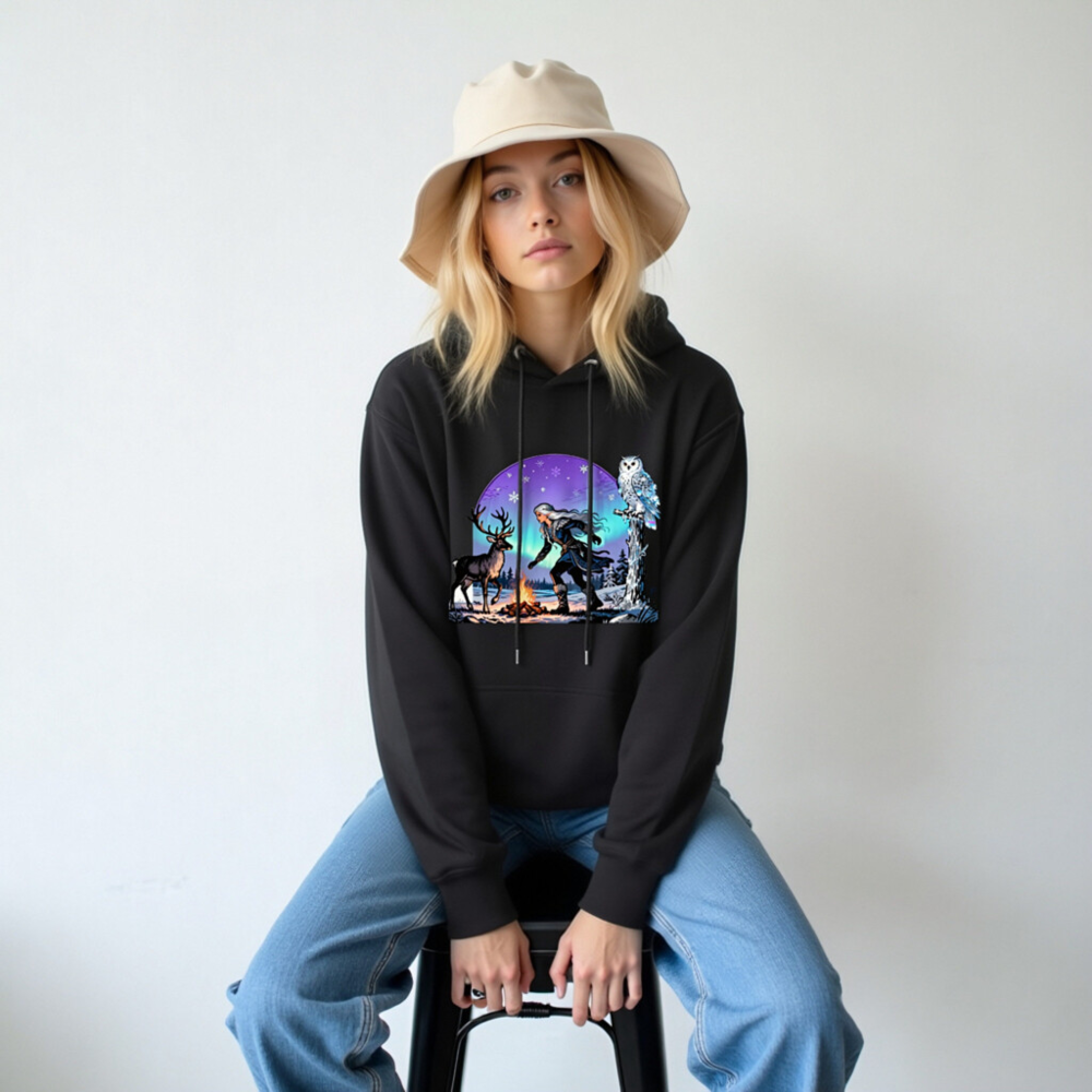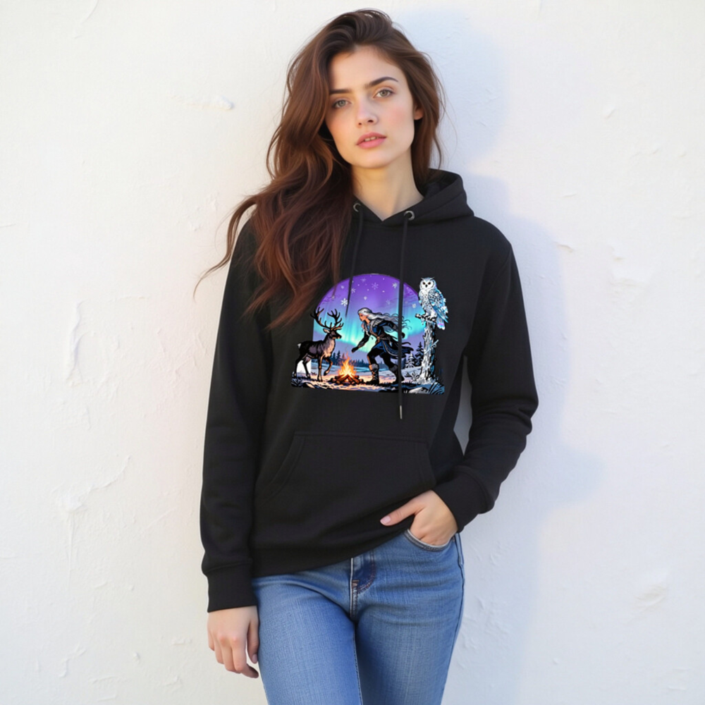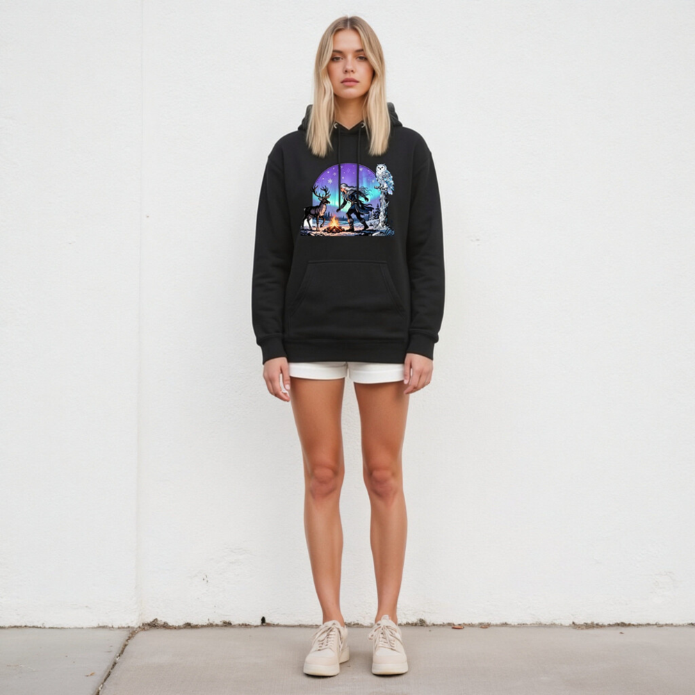 This unisex premium pullover hoodie features a magical winter scene: a silver-haired witch, a reindeer, and a snowy owl beside a campfire under the aurora borealis. Made for comfort and style, this cozy black hoodie is perfect for cold seasons. The vivid, high-resolution print captures the enchanting Nordic fantasy aesthetic—ideal for fans of folklore, nature, and mystical themes.
