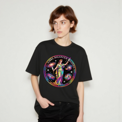 This unisex staple t-shirt features a vibrant, cosmic-themed Libra design with the goddess holding balanced scales and a feather, surrounded by galaxies and stars. ‘Libra Balanced Justice’ encircles the artwork in rainbow hues. Made for comfort and style, it’s ideal for astrology lovers and those who value harmony. Perfect for everyday wear or as a meaningful gift.
