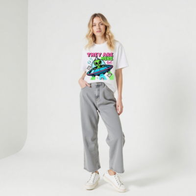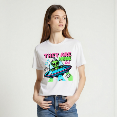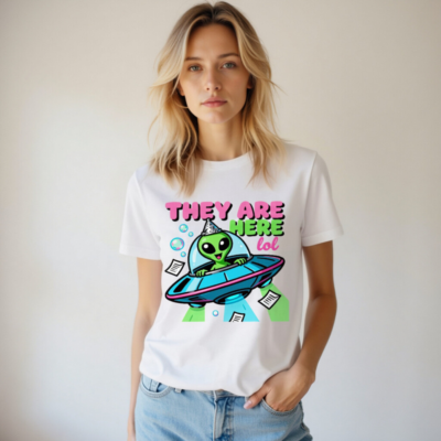 Show off your cosmic humor with this unisex staple t-shirt featuring a cheerful green alien in a blue UFO, wearing a party hat and surrounded by bubbles and papers. The playful ‘THEY ARE HERE lol’ text in bold pink/green adds a fun, meme-worthy vibe. Made for everyday comfort, this classic fit tee is perfect for fans of quirky sci-fi and lighthearted pop culture. Ideal for casual wear or gifting to fellow alien enthusiasts.