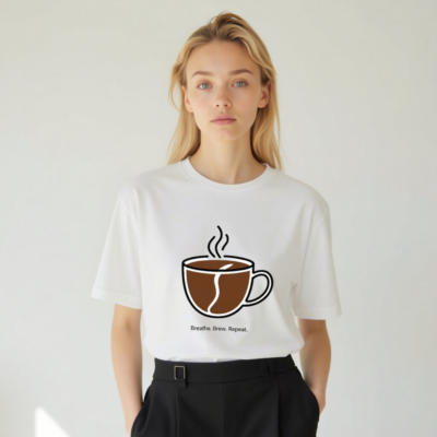 Classic unisex staple t-shirt featuring a minimalist steaming coffee cup graphic with the phrase ‘Breathe. Brew. Repeat.’—perfect for coffee lovers and daily routine enthusiasts. Soft, comfortable fit. Ideal for casual wear or as a thoughtful gift. No added certifications or claims beyond what’s visibly presented.