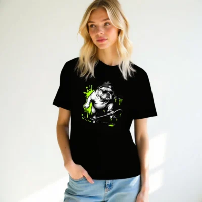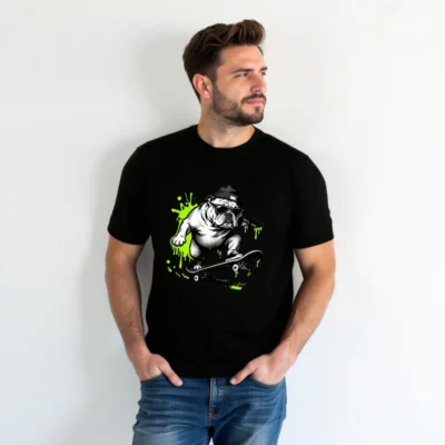 Cool unisex staple t-shirt featuring a bold black-and-white bulldog skater wearing sunglasses and a beanie, surrounded by vibrant neon green paint splatters. Designed for everyday comfort with a relaxed fit. Ideal for casual wear, street style, or gifting. Made from quality cotton blend—durable, soft, and machine-washable. Perfect for fans of urban art and pet culture.