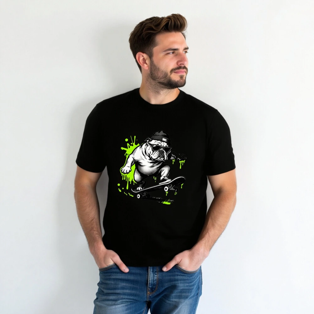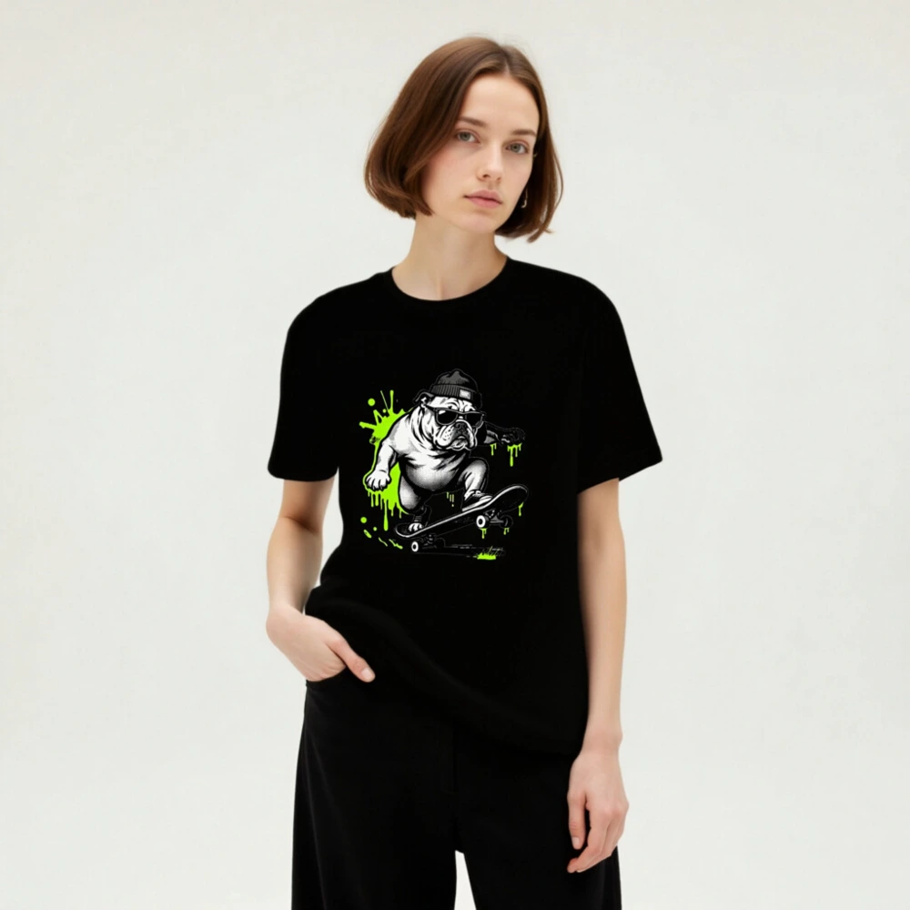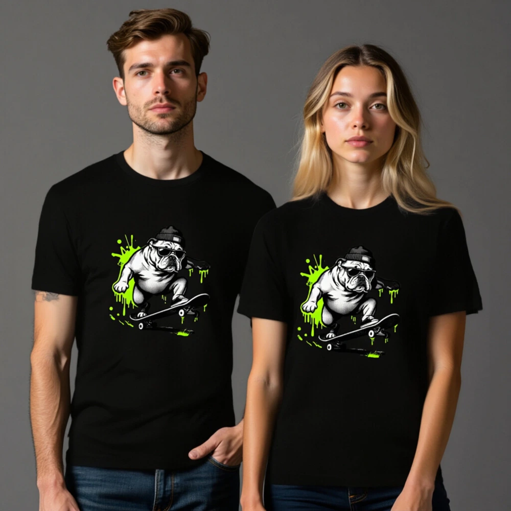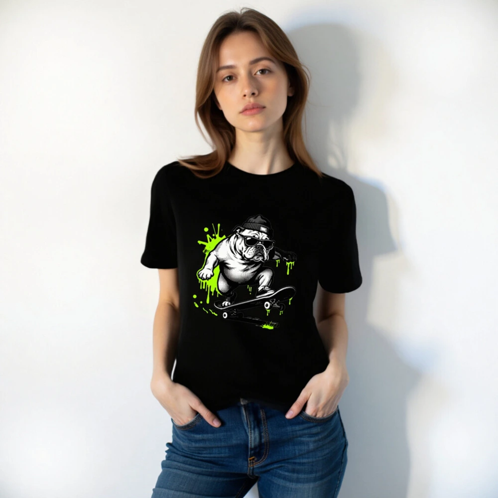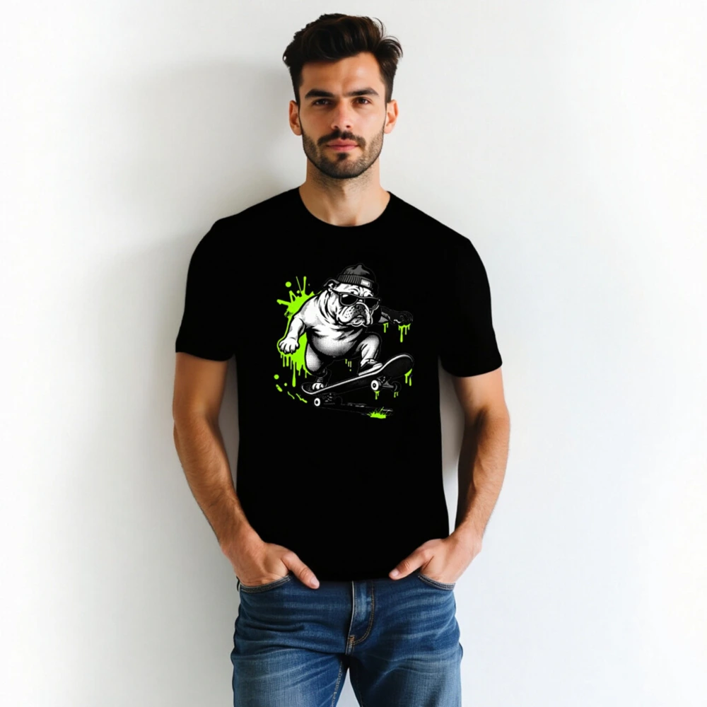 Cool unisex staple t-shirt featuring a bold black-and-white bulldog skater wearing sunglasses and a beanie, surrounded by vibrant neon green paint splatters. Designed for everyday comfort with a relaxed fit. Ideal for casual wear, street style, or gifting. Made from quality cotton blend—durable, soft, and machine-washable. Perfect for fans of urban art and pet culture.