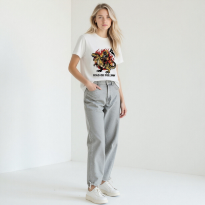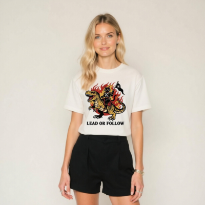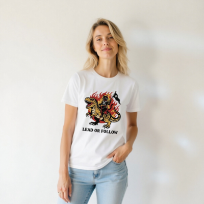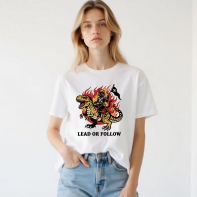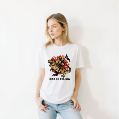 Bold unisex staple t-shirt featuring a fierce cat general riding a roaring T-Rex amid flames, holding a black flag with cross. Inspired by ‘Lead or Follow’ motivational theme. Premium cotton blend, classic fit, versatile for everyday wear. Designed for bold personalities who command attention. Ideal gift for dinosaur lovers and leadership enthusiasts.