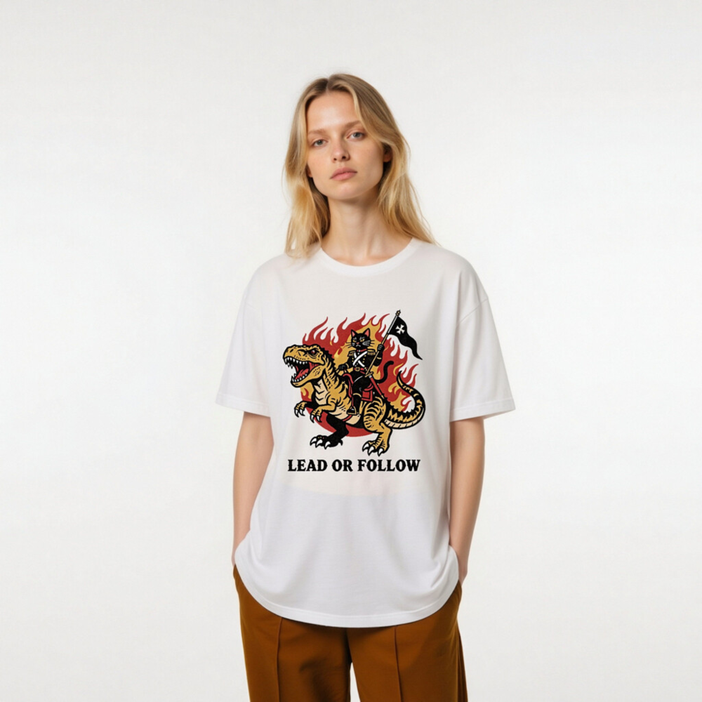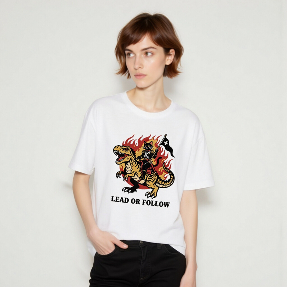 Bold unisex staple t-shirt featuring a fierce cat general riding a roaring T-Rex amid flames, holding a black flag with cross. Inspired by ‘Lead or Follow’ motivational theme. Premium cotton blend, classic fit, versatile for everyday wear. Designed for bold personalities who command attention. Ideal gift for dinosaur lovers and leadership enthusiasts.