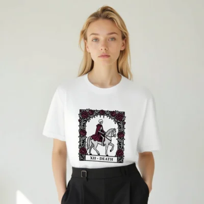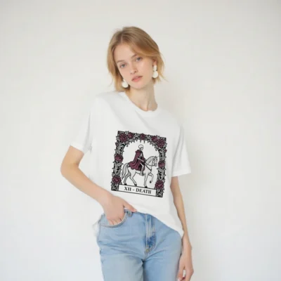 Wear the iconic Death tarot card (XII) in this unisex staple t-shirt: a skeleton in burgundy cloak riding a white horse, framed by gothic roses. Designed for comfort and style, this premium cotton tee fits all genders and occasions. Ideal for occult enthusiasts, tarot lovers, and dark aesthetics fans. Classic fit, soft fabric, ready to elevate your wardrobe with timeless symbolism.