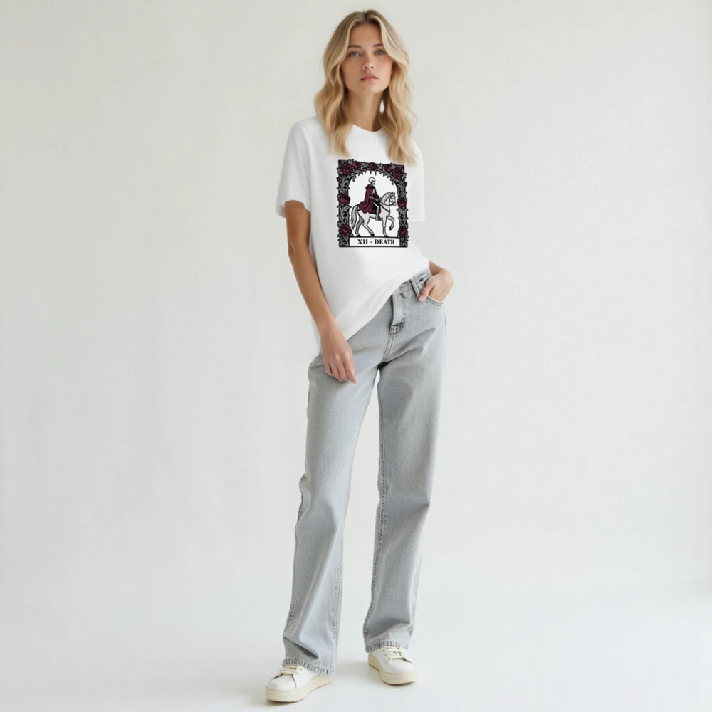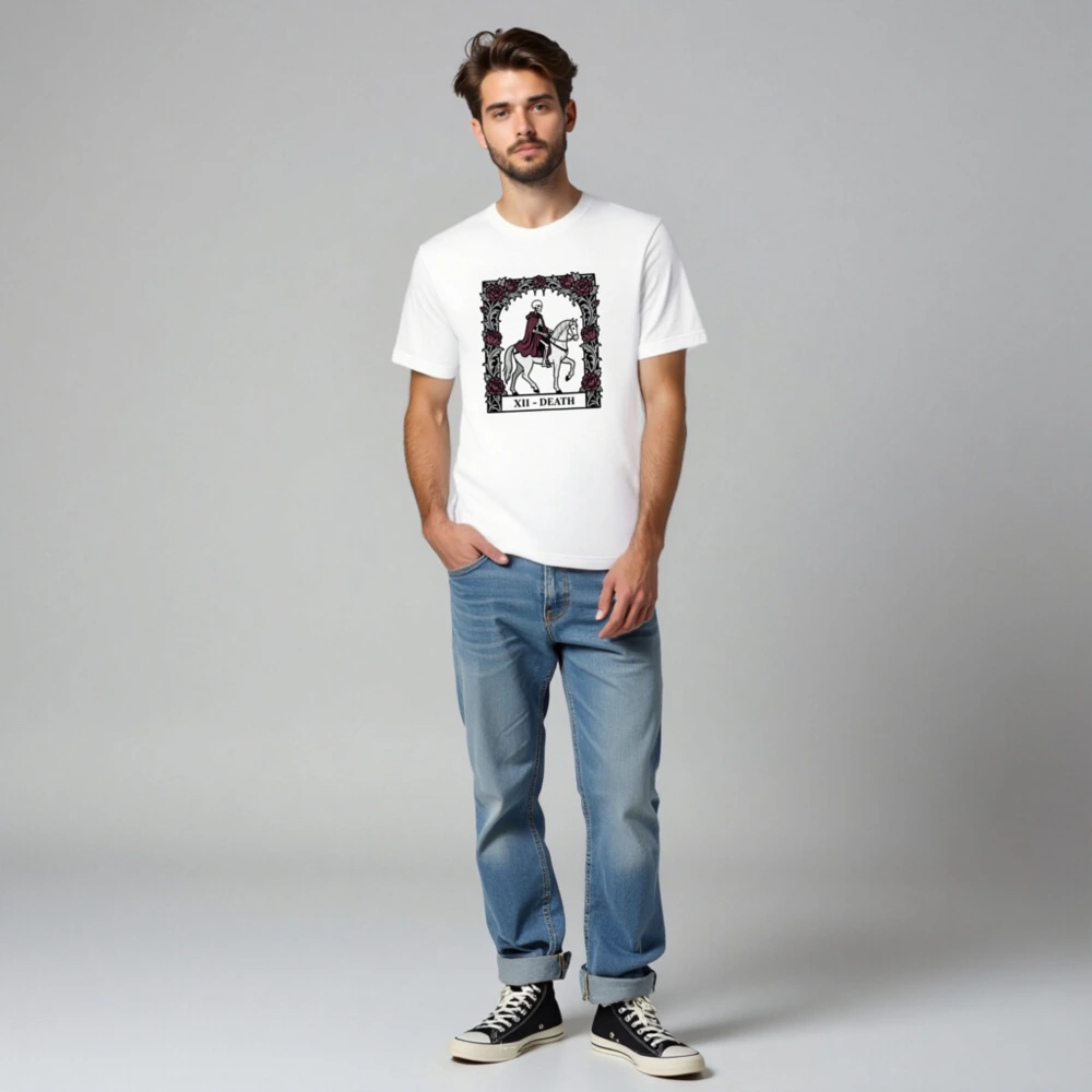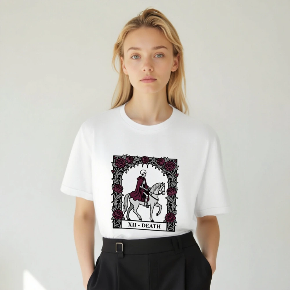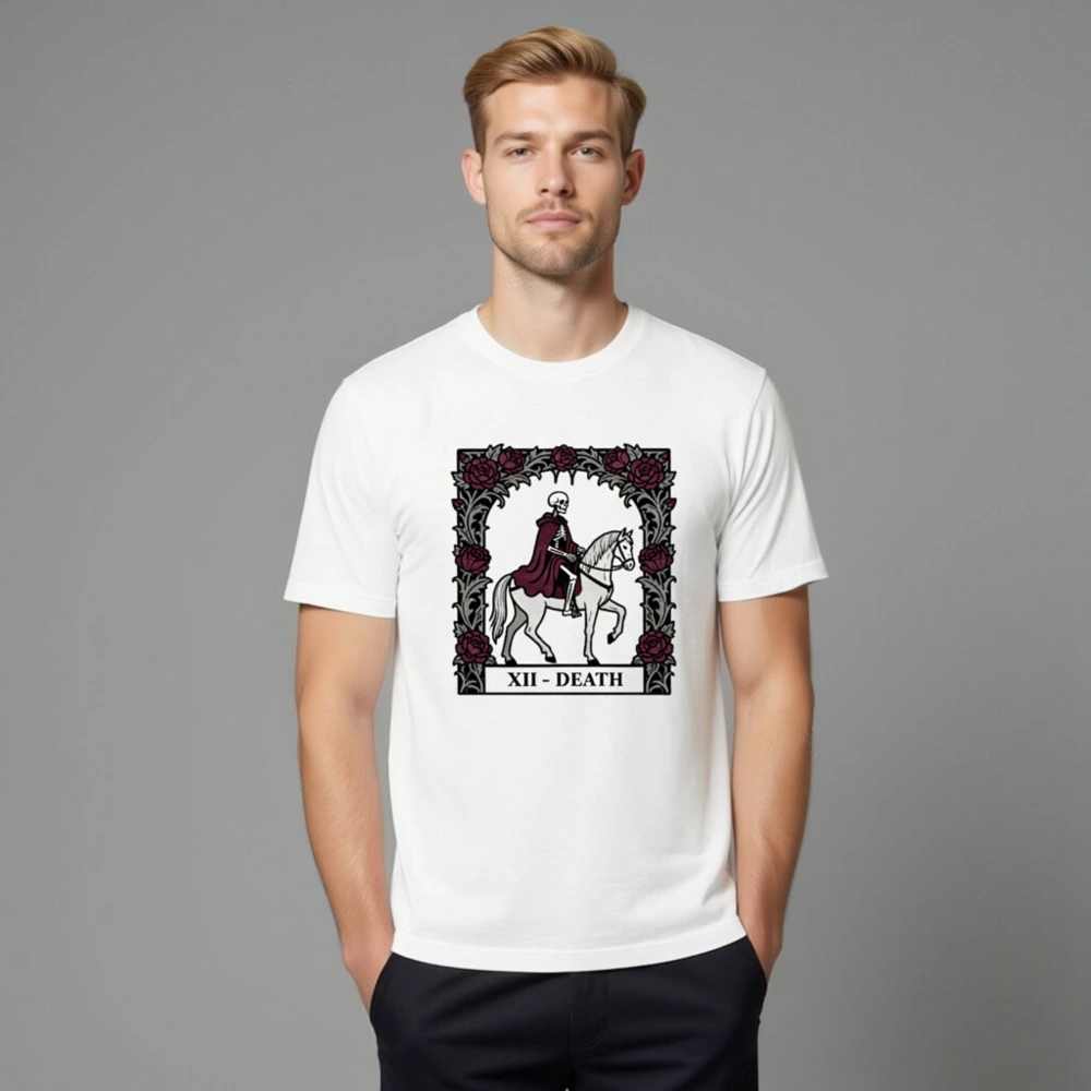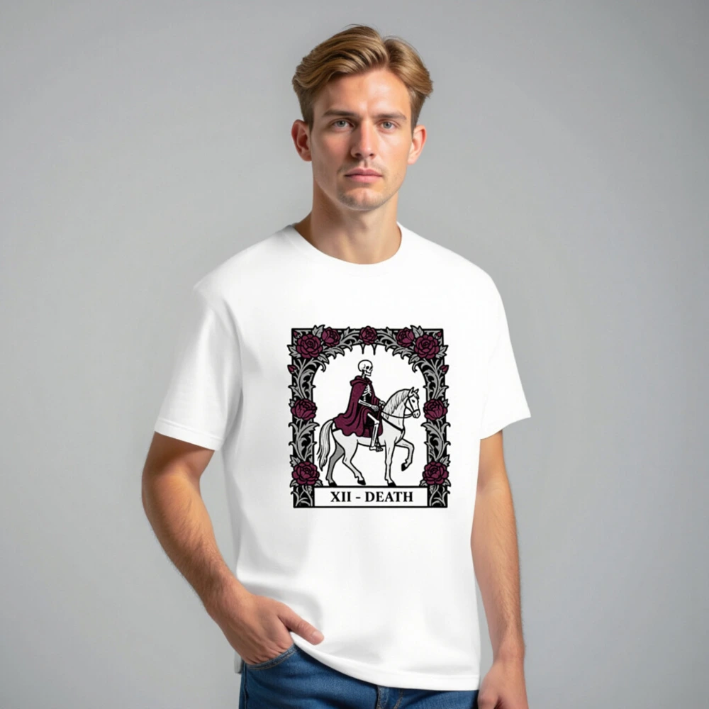 Wear the iconic Death tarot card (XII) in this unisex staple t-shirt: a skeleton in burgundy cloak riding a white horse, framed by gothic roses. Designed for comfort and style, this premium cotton tee fits all genders and occasions. Ideal for occult enthusiasts, tarot lovers, and dark aesthetics fans. Classic fit, soft fabric, ready to elevate your wardrobe with timeless symbolism.