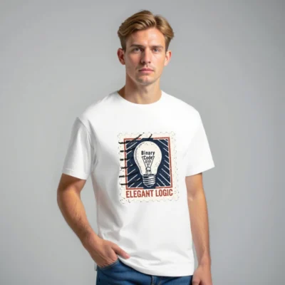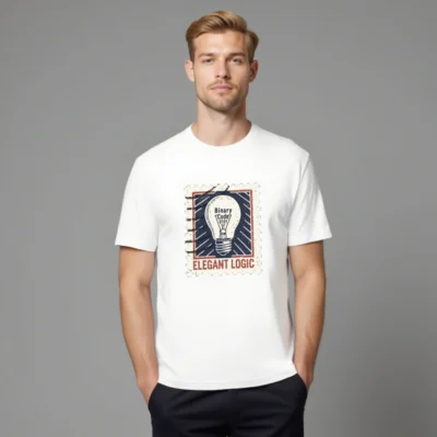 This unisex staple t-shirt features a vintage stamp-style graphic with a lightbulb labeled ‘Binary Code 0101’ and the phrase ‘Elegant Logic’ below. Crafted for comfort and everyday wear, it’s a tech-savvy, minimalist design perfect for programmers, engineers, and logic enthusiasts. The clean white fabric and classic fit make it versatile for all genders. Ideal for casual wear or as a thoughtful gift for tech lovers.