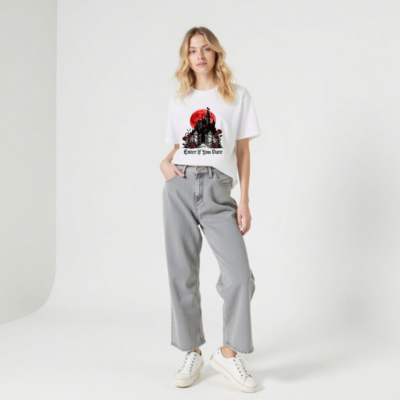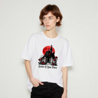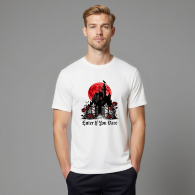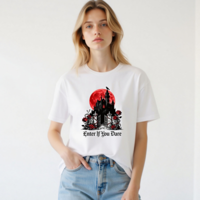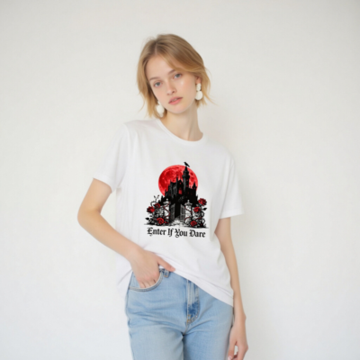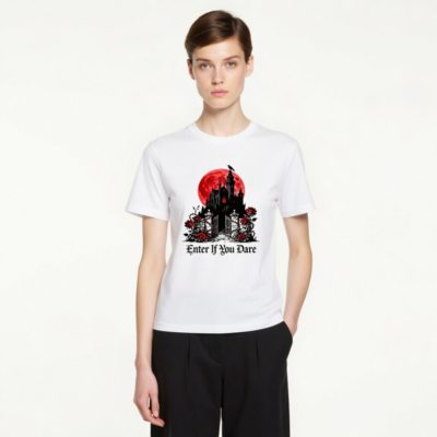 A unisex staple t-shirt featuring a striking gothic design: a dark castle silhouetted against a vivid red blood moon, flanked by thorny roses and an open iron gate. A crow perches atop the tower, enhancing the eerie ambiance. The bold phrase ‘Enter If You Dare’ completes the haunting aesthetic. Perfect for fans of horror, fantasy, and dark romance. Premium cotton blend, comfortable fit, versatile styling.