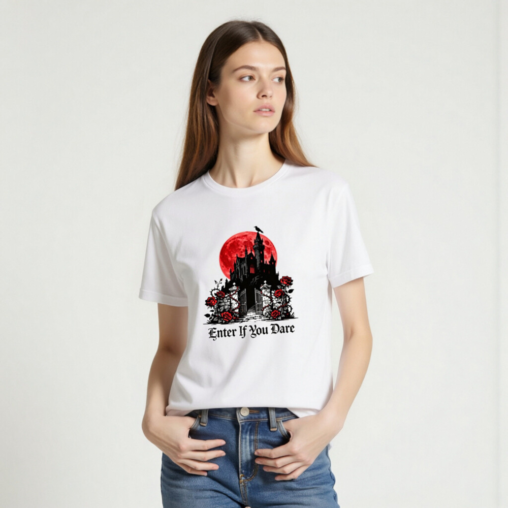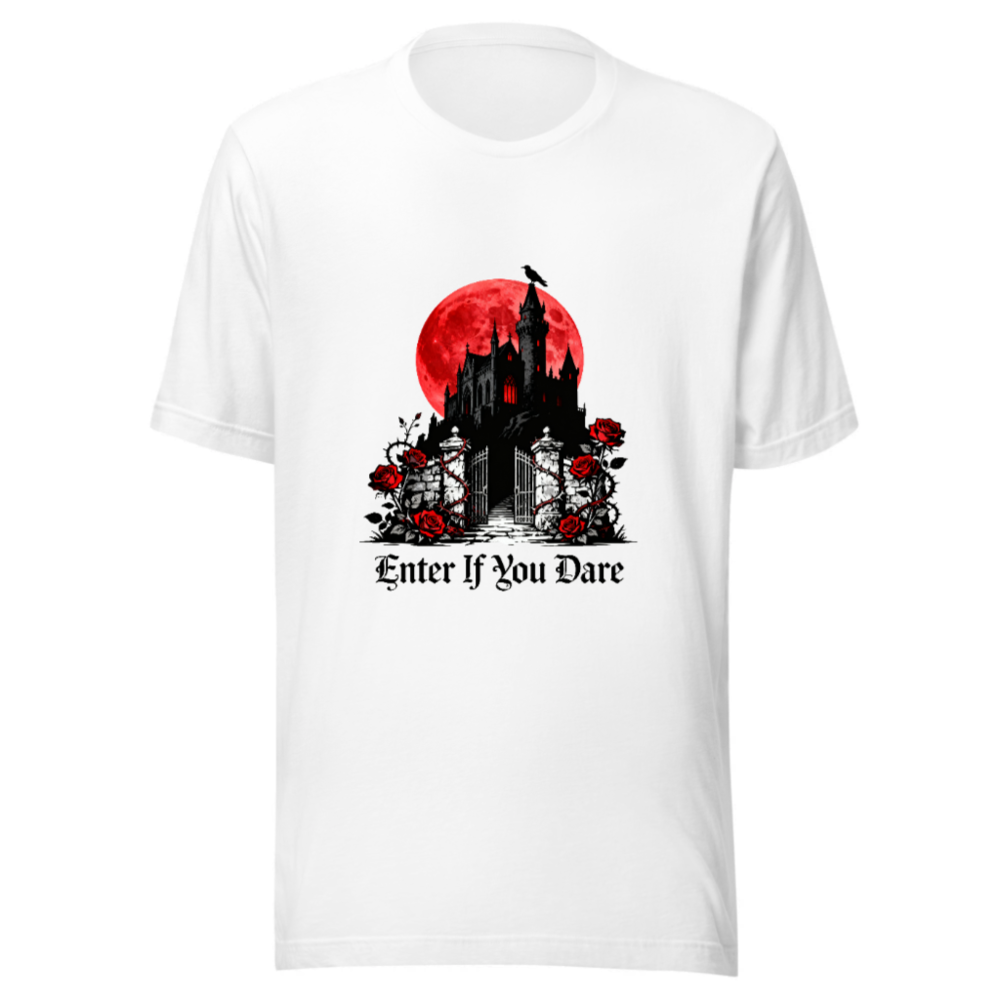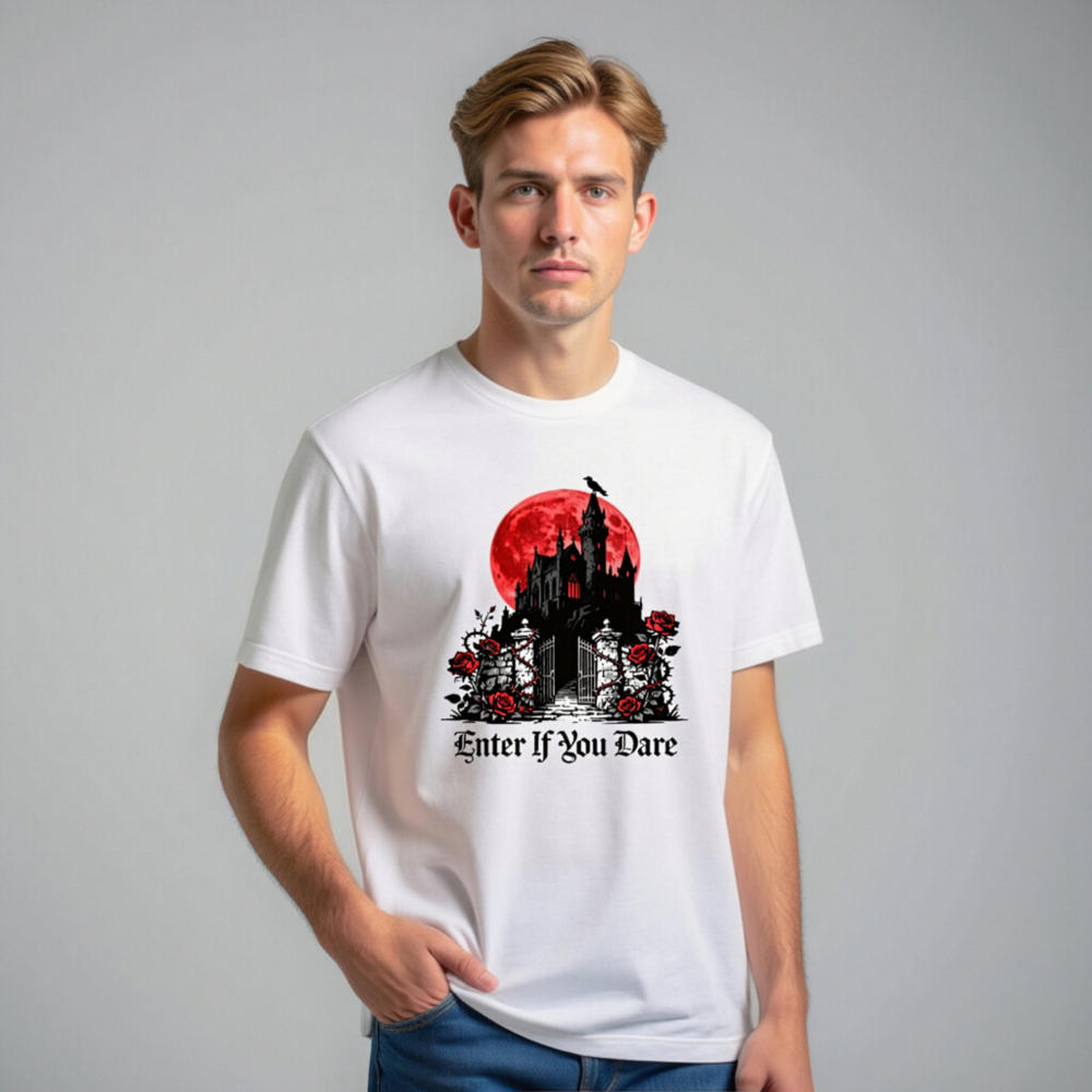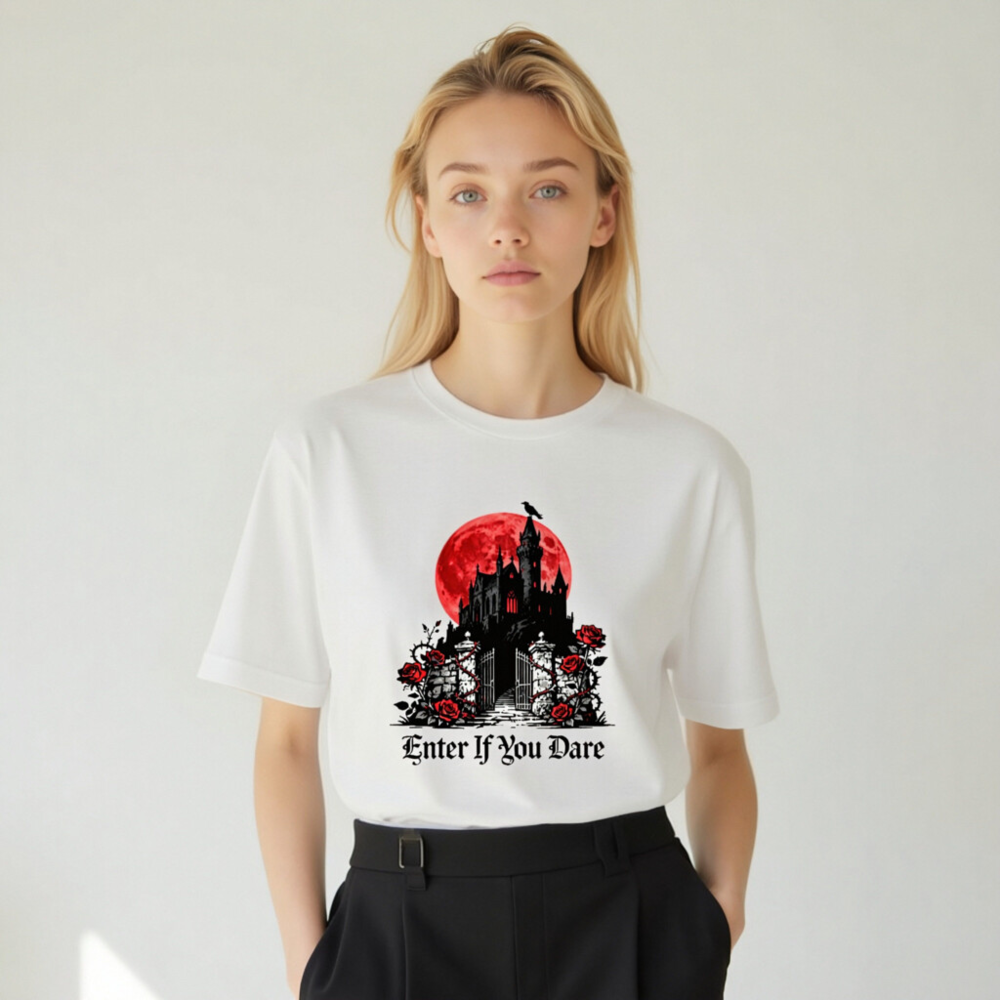 A unisex staple t-shirt featuring a striking gothic design: a dark castle silhouetted against a vivid red blood moon, flanked by thorny roses and an open iron gate. A crow perches atop the tower, enhancing the eerie ambiance. The bold phrase ‘Enter If You Dare’ completes the haunting aesthetic. Perfect for fans of horror, fantasy, and dark romance. Premium cotton blend, comfortable fit, versatile styling.