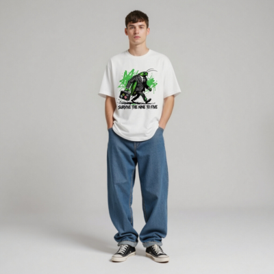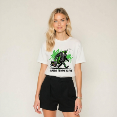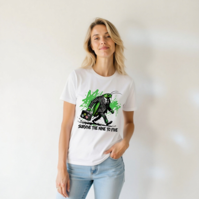 A bold unisex staple t-shirt featuring a vibrant green grasshopper in a black pinstripe suit, carrying a vintage-style briefcase adorned with travel stickers. The design captures the ‘survive the nine to five’ office worker struggle with humor and flair. High-quality cotton fabric, classic fit, perfect for casual wear or as a statement piece. Ideal for fans of quirky, pop-culture-inspired fashion.