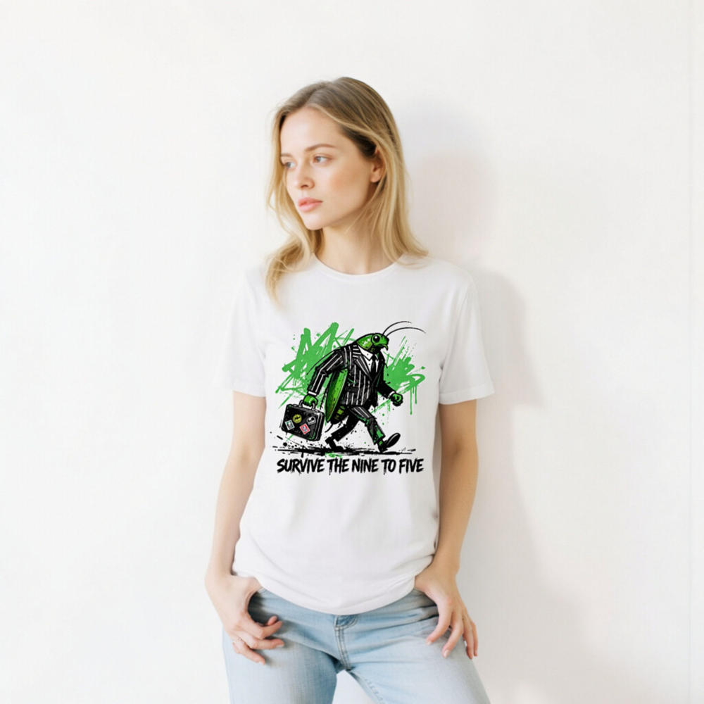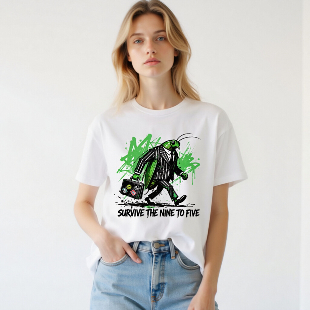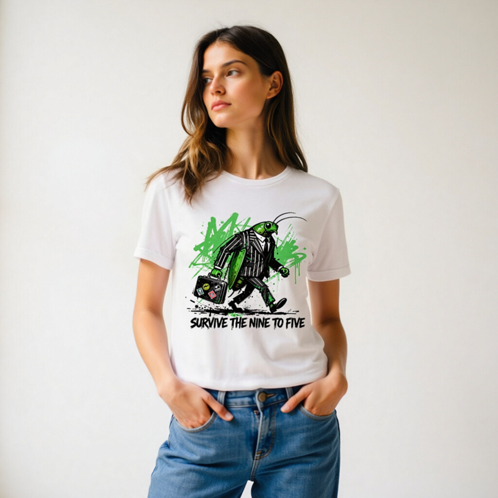 A bold unisex staple t-shirt featuring a vibrant green grasshopper in a black pinstripe suit, carrying a vintage-style briefcase adorned with travel stickers. The design captures the ‘survive the nine to five’ office worker struggle with humor and flair. High-quality cotton fabric, classic fit, perfect for casual wear or as a statement piece. Ideal for fans of quirky, pop-culture-inspired fashion.