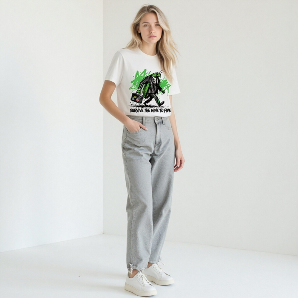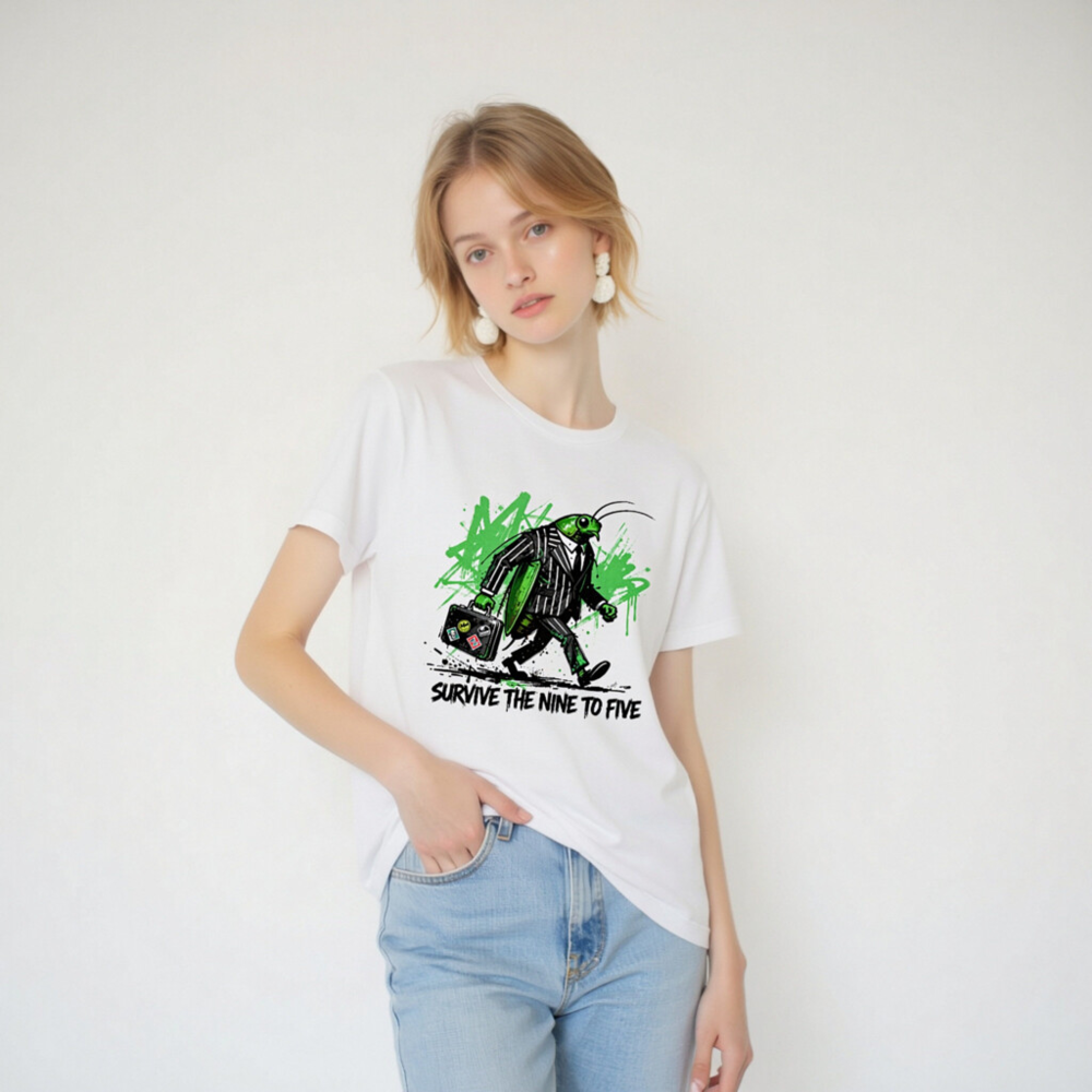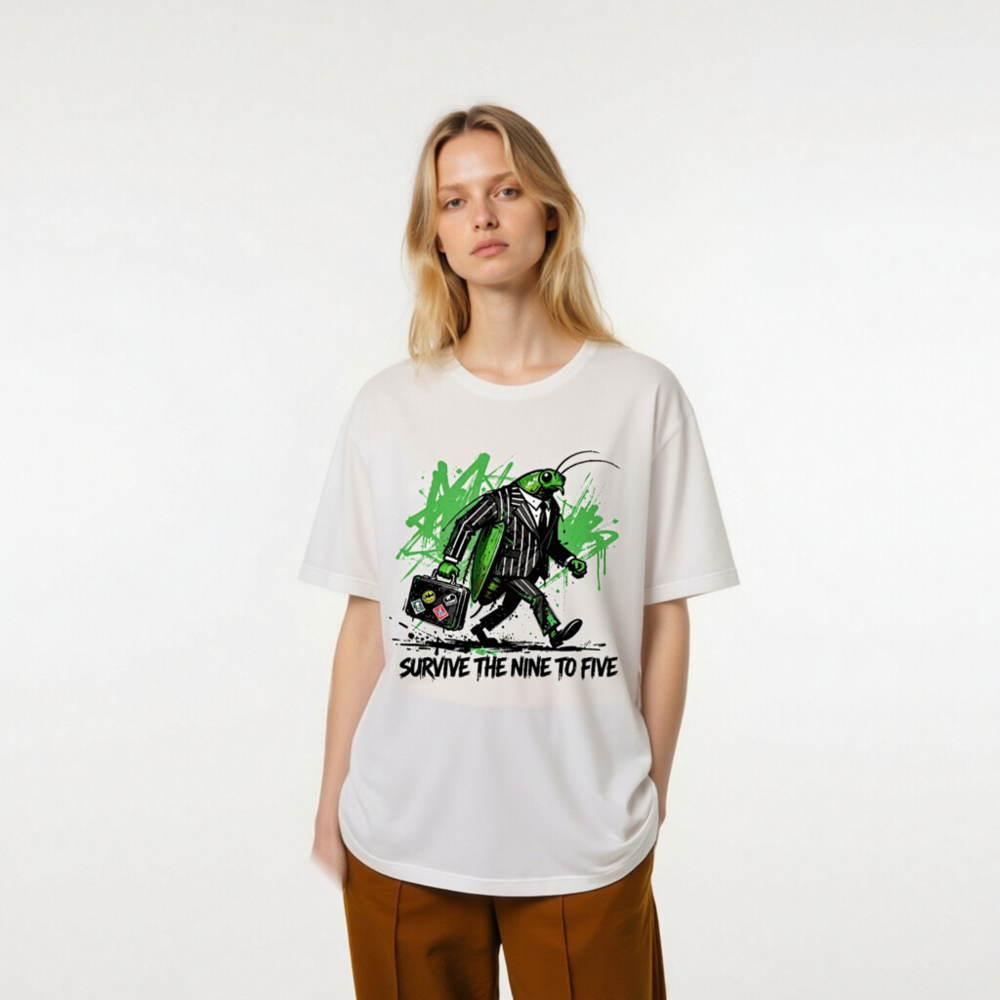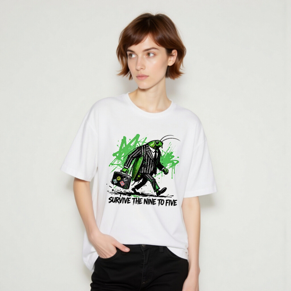 A bold unisex staple t-shirt featuring a vibrant green grasshopper in a black pinstripe suit, carrying a vintage-style briefcase adorned with travel stickers. The design captures the ‘survive the nine to five’ office worker struggle with humor and flair. High-quality cotton fabric, classic fit, perfect for casual wear or as a statement piece. Ideal for fans of quirky, pop-culture-inspired fashion.