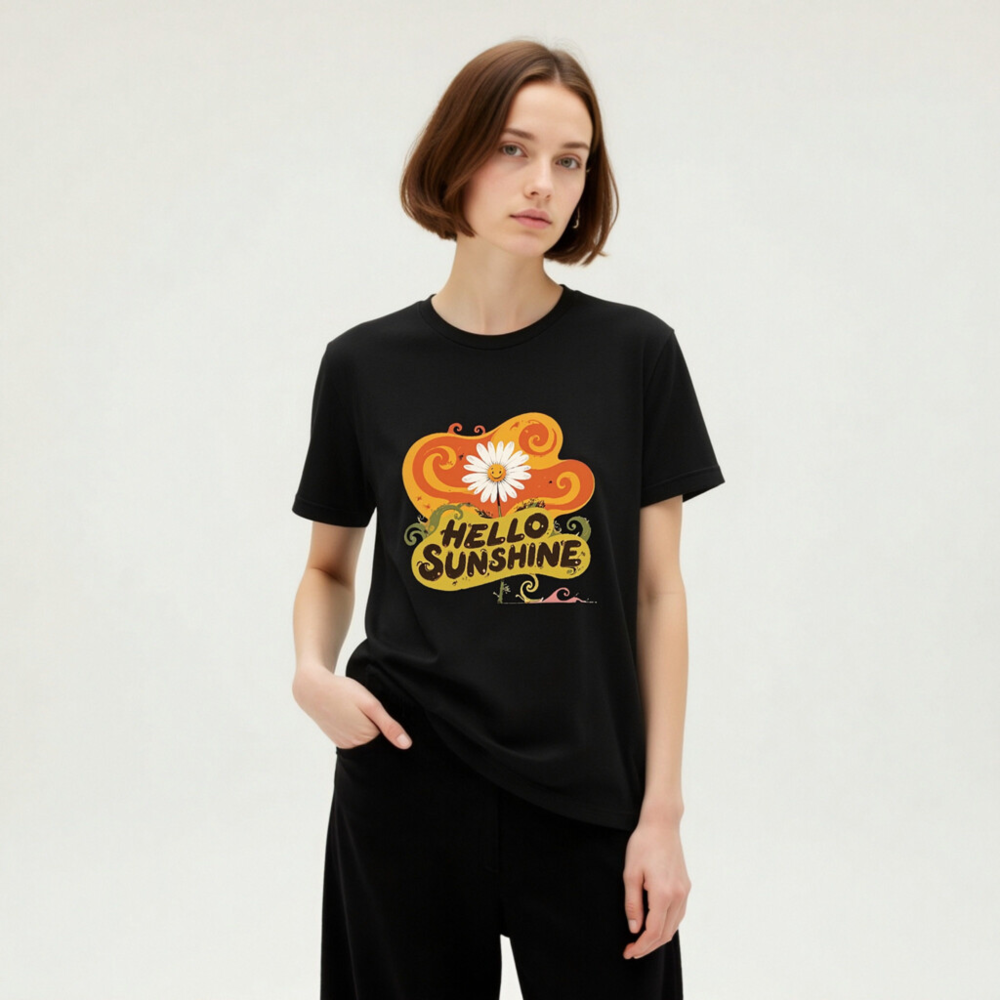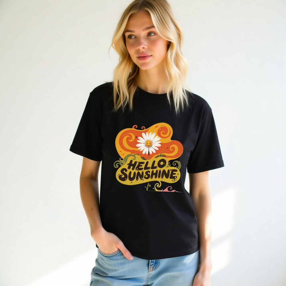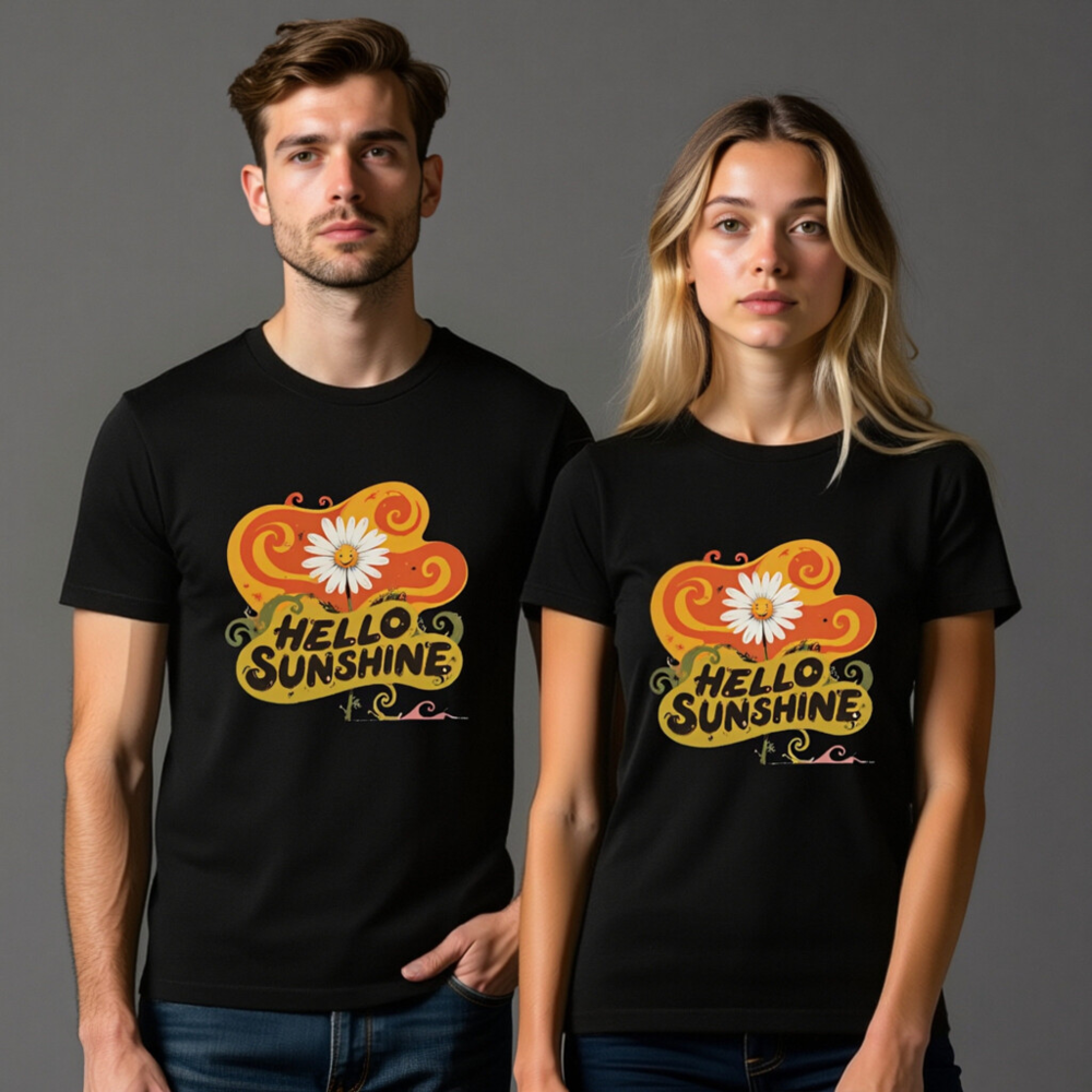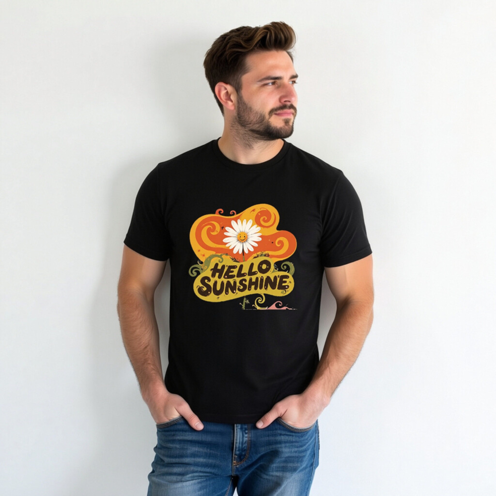 This unisex staple t-shirt features a cheerful ‘Hello Sunshine’ design with a smiling daisy and vibrant swirls in warm orange, yellow, and green tones. Crafted for everyday comfort, it offers a classic fit suitable for all genders. The bold graphic makes it a standout casual piece—ideal for sunny days or uplifting style. No extra certifications or claims are included beyond the product’s stated attributes.