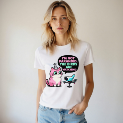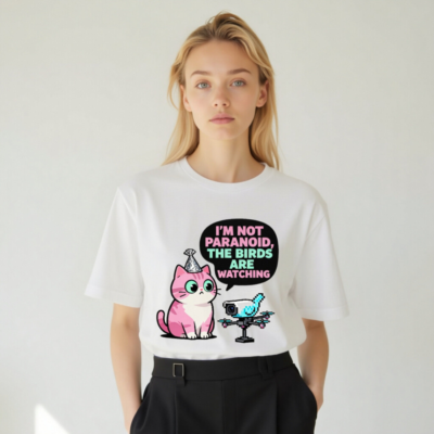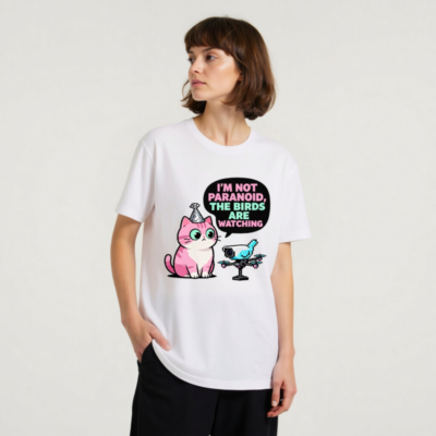 This unisex staple t-shirt features a playful, pixel-art inspired design: a pink cat with a party hat and a drone-shaped bird, paired with the witty quote ‘I’m Not Paranoid, The Birds Are Watching.’ Made for everyday comfort, this classic fit tee blends humor with tech-savvy charm—perfect for fans of quirky pop culture, cats, and digital satire. Ideal as a fun gift or personal statement piece.
