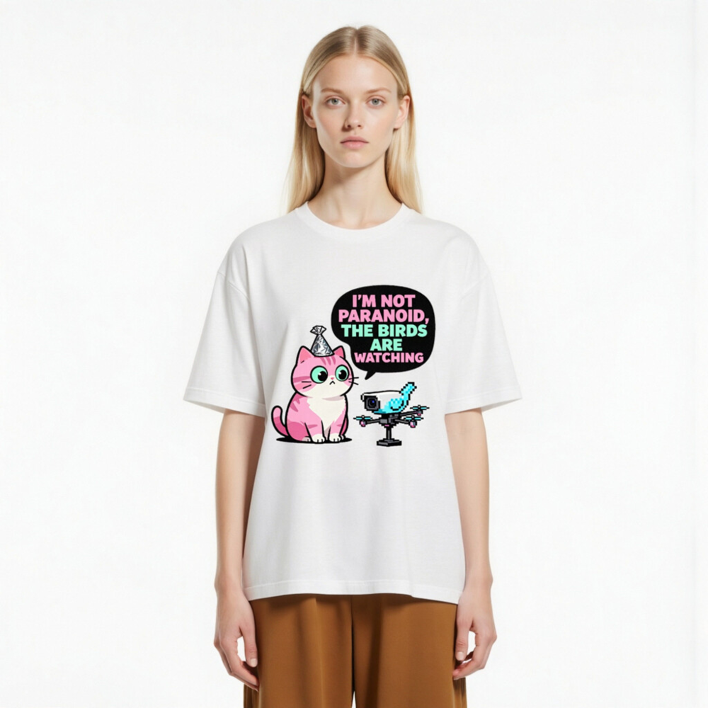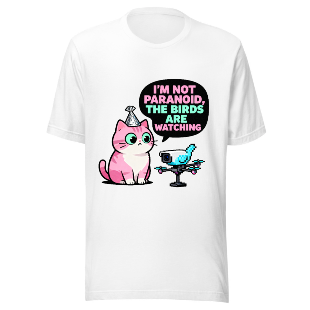 Unisex Staple T-Shirt: ‘I’m Not Paranoid, The Birds Are Watching’ Cat & Drone Graphic Tee