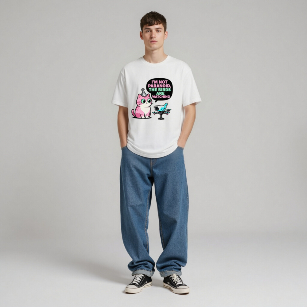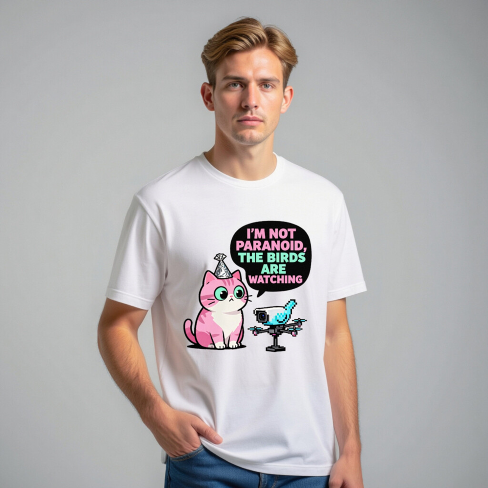 This unisex staple t-shirt features a playful, pixel-art inspired design: a pink cat with a party hat and a drone-shaped bird, paired with the witty quote ‘I’m Not Paranoid, The Birds Are Watching.’ Made for everyday comfort, this classic fit tee blends humor with tech-savvy charm—perfect for fans of quirky pop culture, cats, and digital satire. Ideal as a fun gift or personal statement piece.