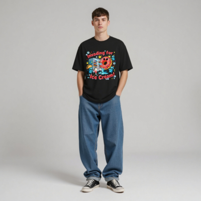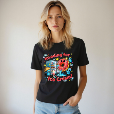 A fun, unisex staple t-shirt featuring a playful ‘Invading for Ice Cream!’ design with blue aliens, a giant sprinkled donut, a taco, and an ice cream sundae. Perfect for food lovers and pop culture fans. Soft cotton blend, classic fit, great for casual wear. Designed for comfort and bold expression.