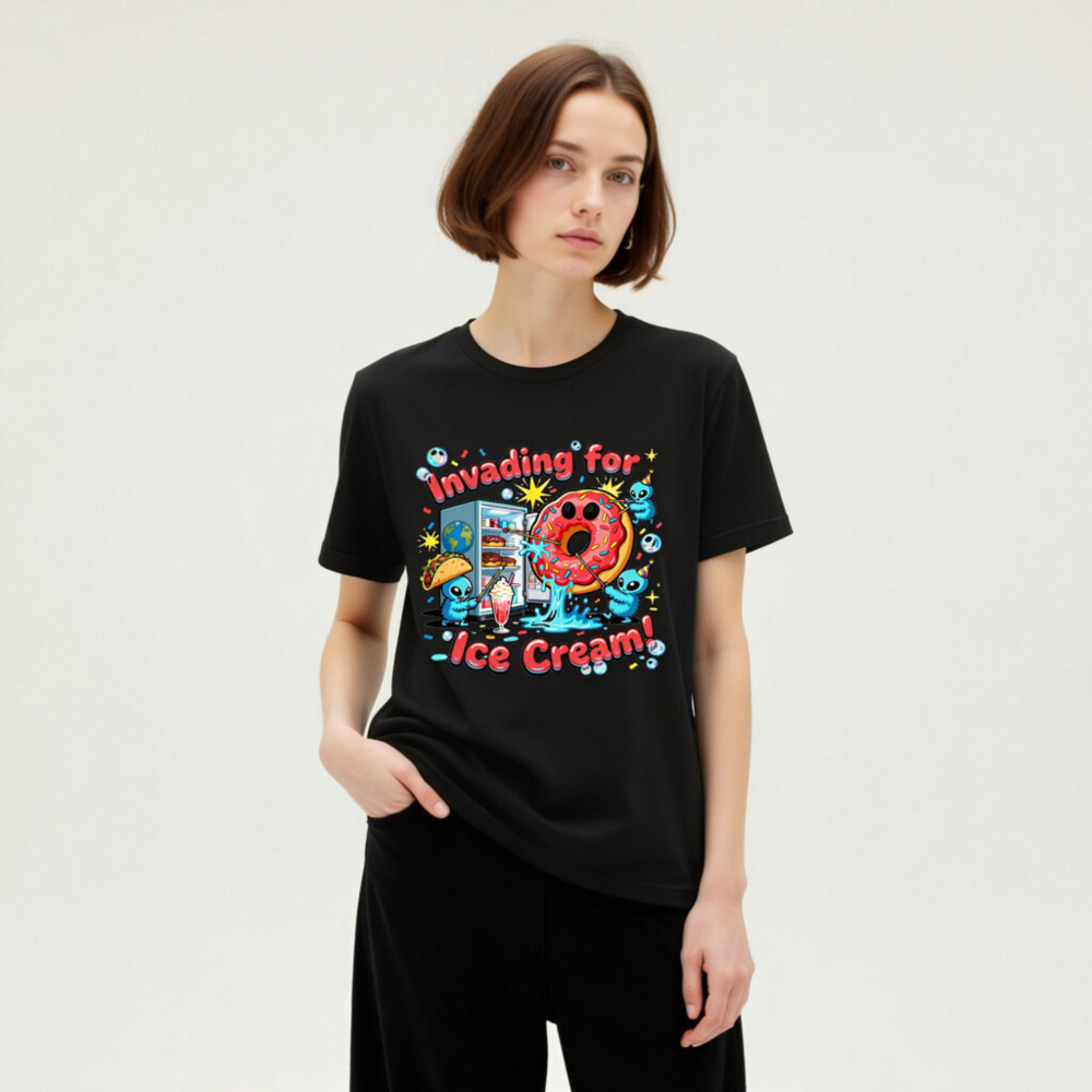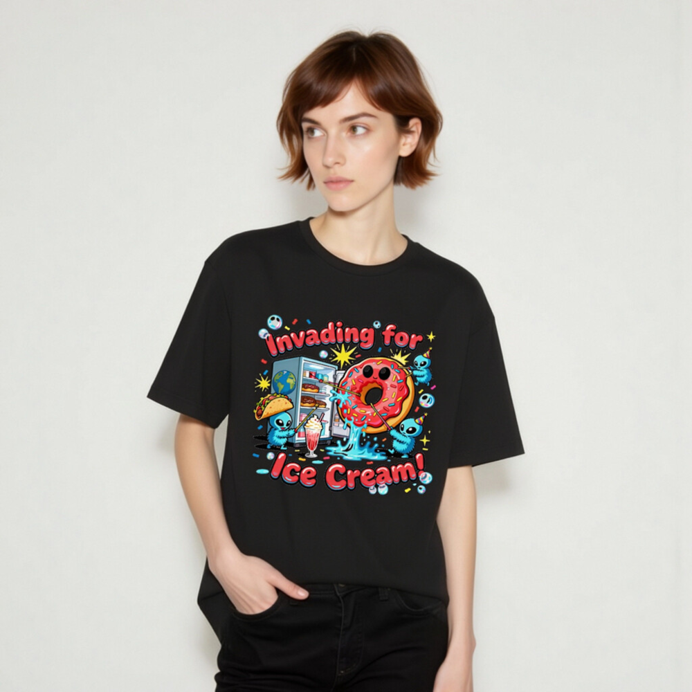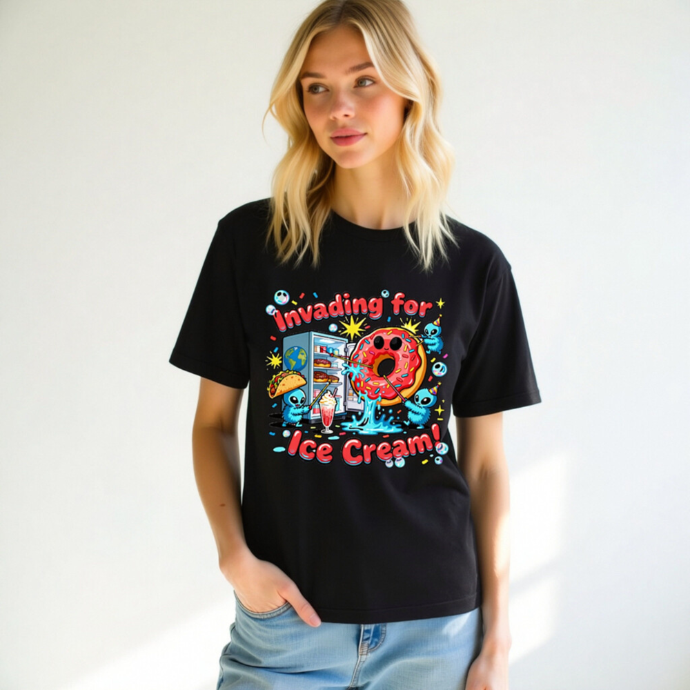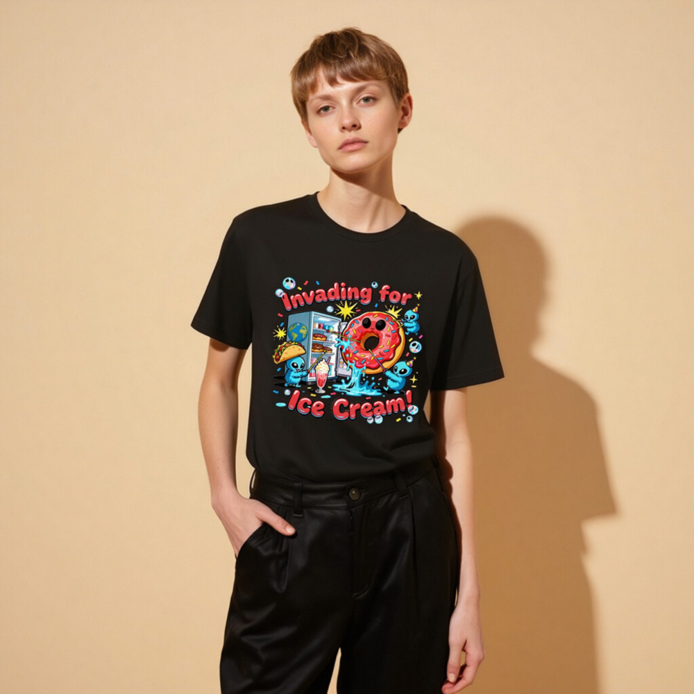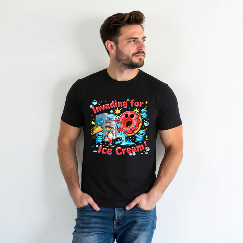 A fun, unisex staple t-shirt featuring a playful ‘Invading for Ice Cream!’ design with blue aliens, a giant sprinkled donut, a taco, and an ice cream sundae. Perfect for food lovers and pop culture fans. Soft cotton blend, classic fit, great for casual wear. Designed for comfort and bold expression.