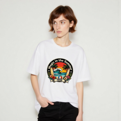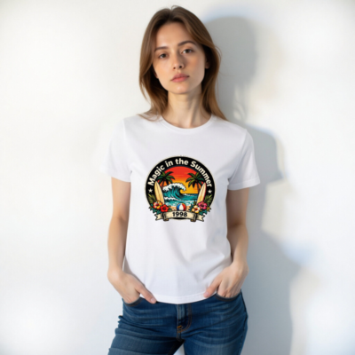 Classic unisex staple t-shirt featuring a vibrant vintage-style ‘Magic in the Summer 1998’ graphic with palm trees, ocean wave, surfboards, hibiscus flowers, and beach ball. Soft cotton blend for everyday comfort. Timeless summer aesthetic—perfect for casual wear or nostalgic collectors. Designed for all genders, true to size.