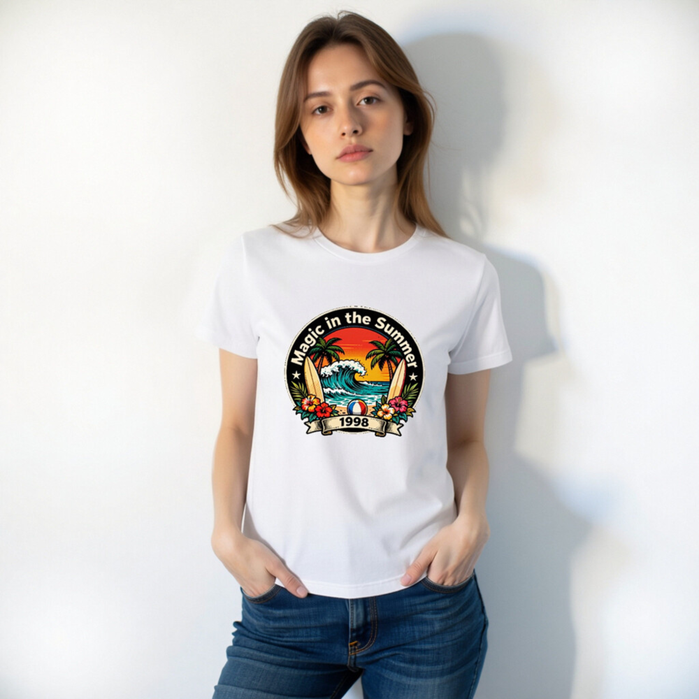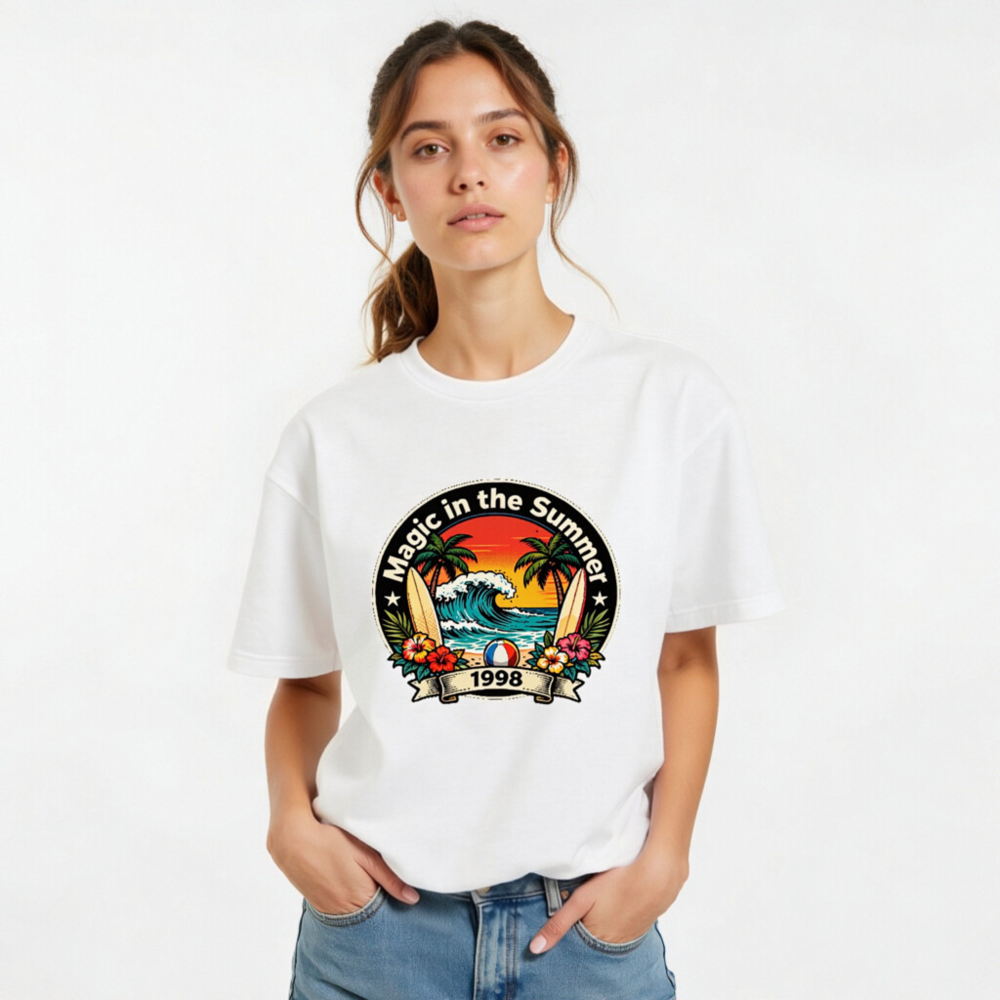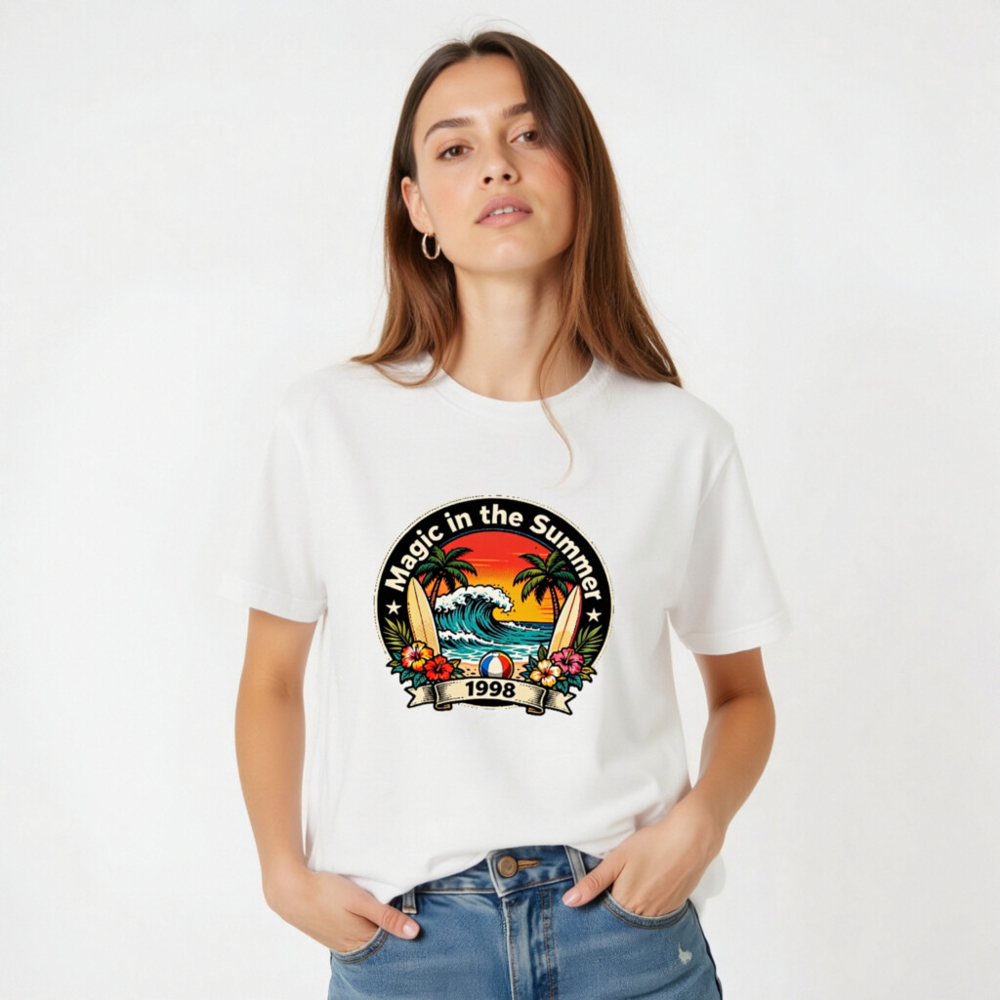 Classic unisex staple t-shirt featuring a vibrant vintage-style ‘Magic in the Summer 1998’ graphic with palm trees, ocean wave, surfboards, hibiscus flowers, and beach ball. Soft cotton blend for everyday comfort. Timeless summer aesthetic—perfect for casual wear or nostalgic collectors. Designed for all genders, true to size.