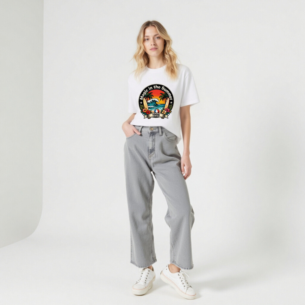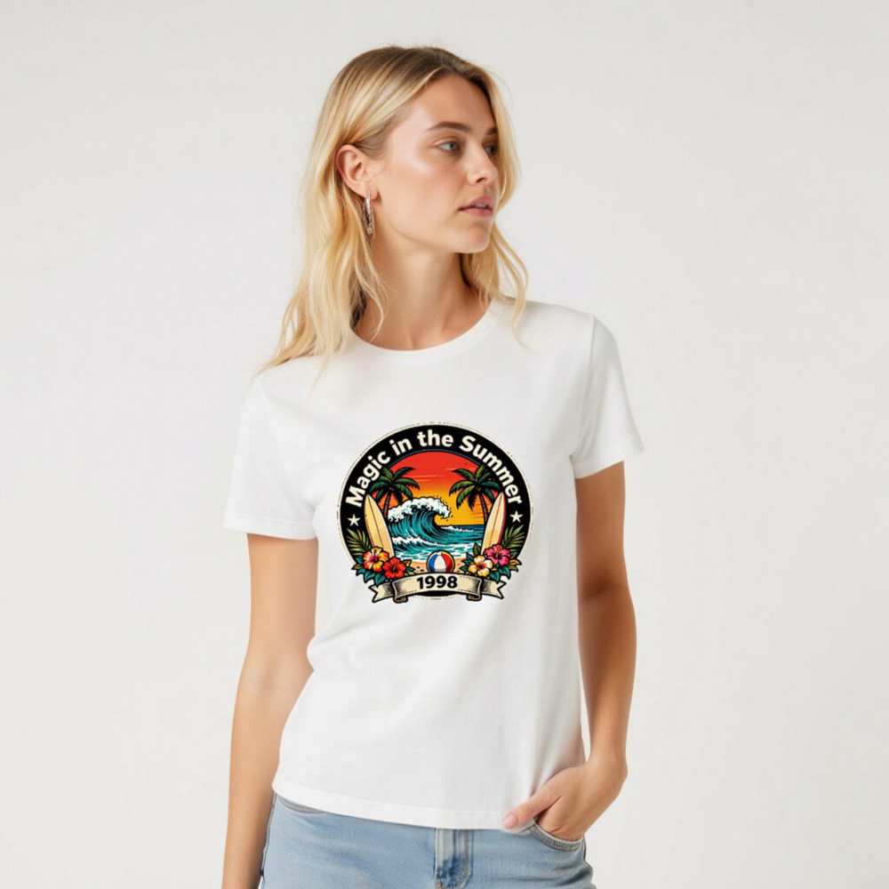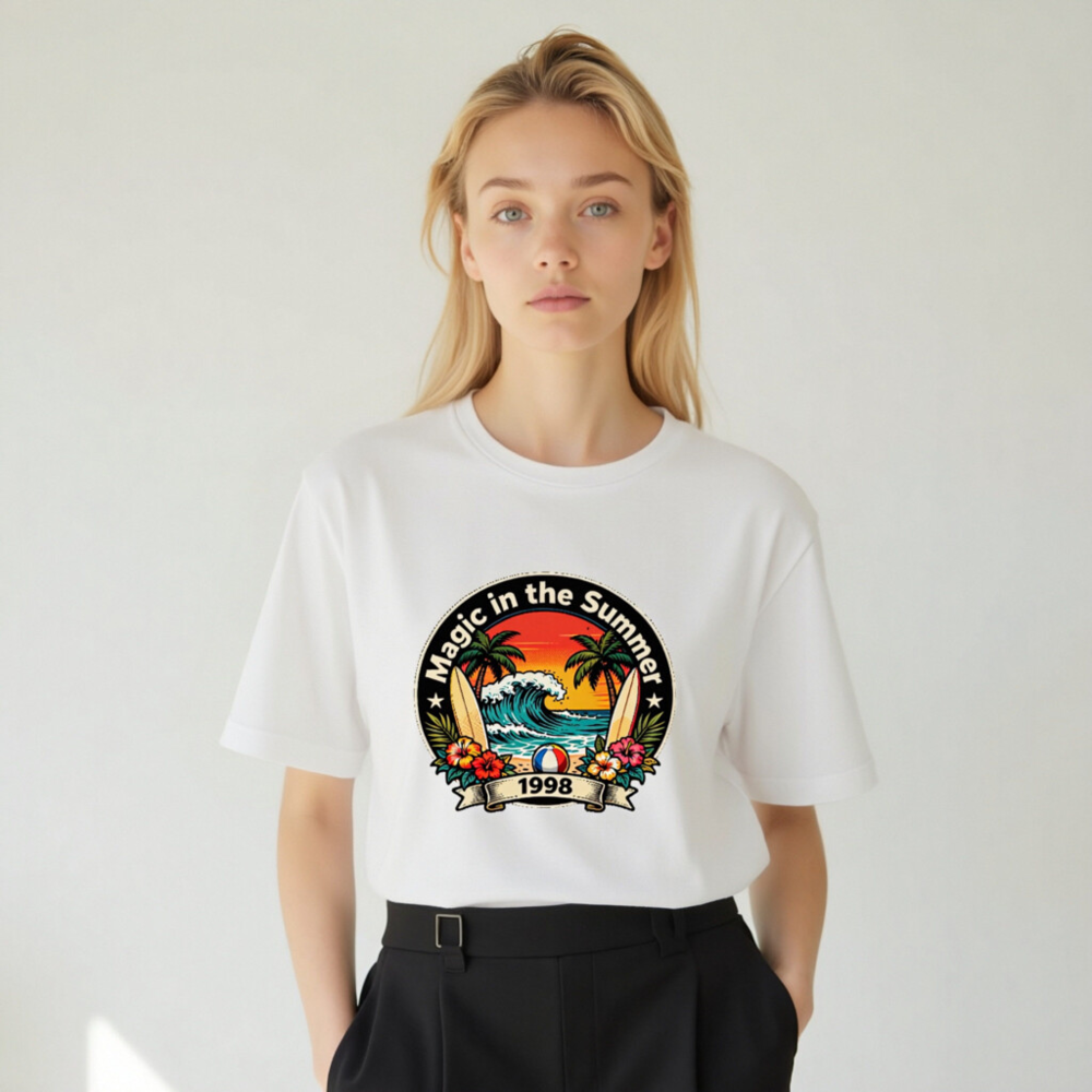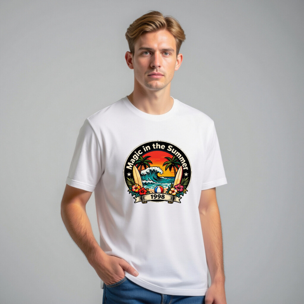 Classic unisex staple t-shirt featuring a vibrant vintage-style ‘Magic in the Summer 1998’ graphic with palm trees, ocean wave, surfboards, hibiscus flowers, and beach ball. Soft cotton blend for everyday comfort. Timeless summer aesthetic—perfect for casual wear or nostalgic collectors. Designed for all genders, true to size.