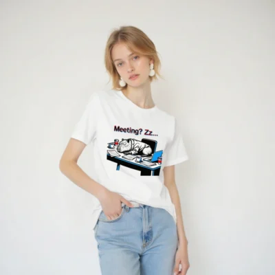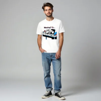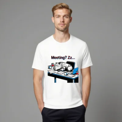 This unisex staple t-shirt features a humorous office scene: a capybara in a suit napping on a cluttered desk with coffee cups, papers, and a laptop—perfect for remote workers, meeting fatigue fans, or anyone who’s ever dozed off in a Zoom call. Lightweight, classic fit, great for everyday wear. Ideal gift for coworkers, students, or anyone who loves quirky animal humor.