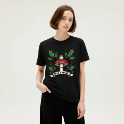 A unisex staple t-shirt featuring a charming illustration of a green frog perched atop a red-and-white mushroom, surrounded by oak leaves and vines. The design is centered around the ‘MUD & MAGIC’ banner, evoking woodland whimsy. Made for everyday comfort with a classic fit, this tee blends nature-inspired art with versatile styling—perfect for fans of fantasy, forest themes, or cozy aesthetics.