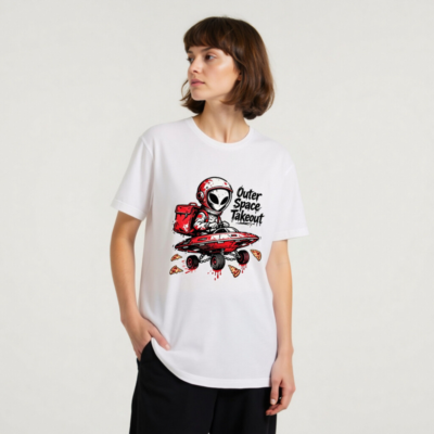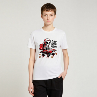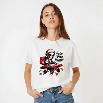 A playful unisex staple t-shirt featuring a red-helmeted alien delivering pizza in a flying saucer—’Outer Space Takeout’ text adds cosmic humor. Designed for casual wear, this graphic tee blends sci-fi fun with everyday comfort. Ideal for space enthusiasts, pizza lovers, and fans of quirky pop culture. Soft cotton blend, classic fit, ready to launch your style into orbit.