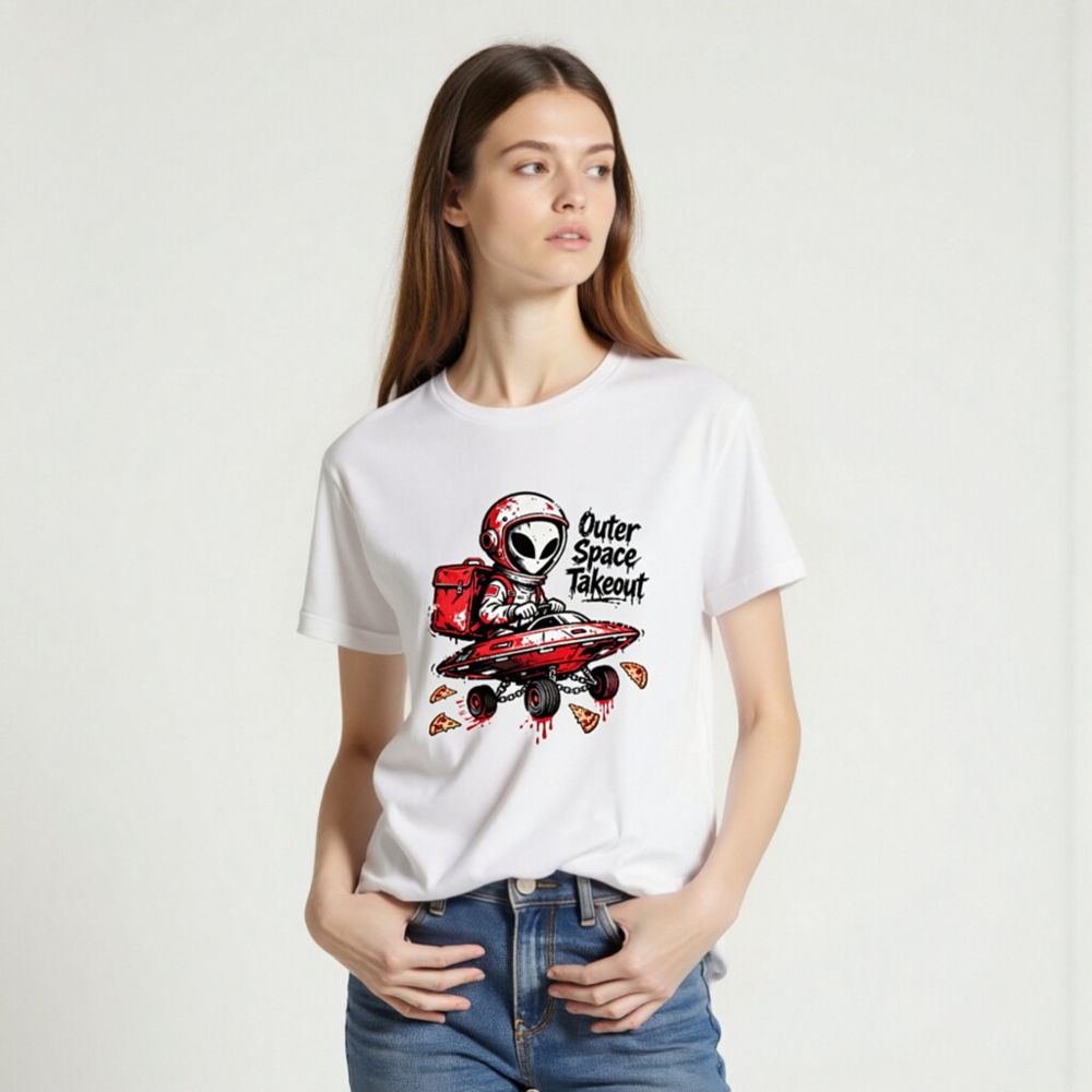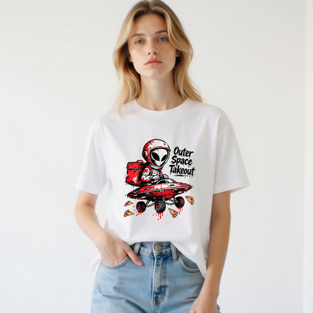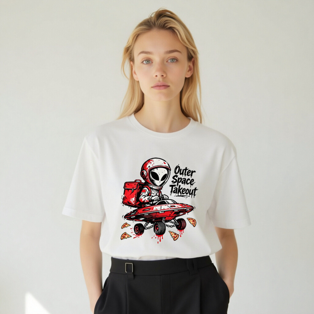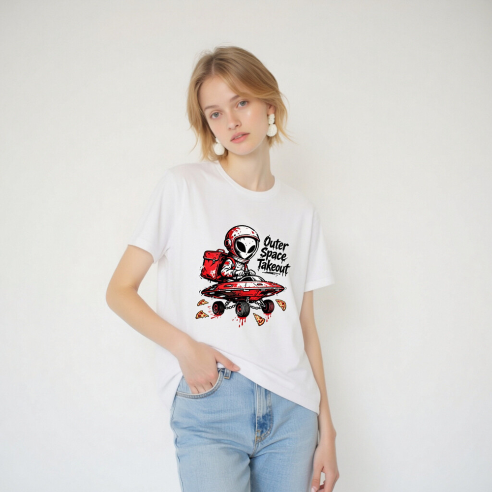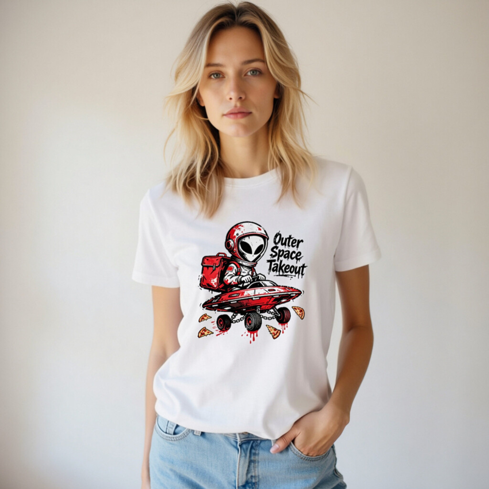 A playful unisex staple t-shirt featuring a red-helmeted alien delivering pizza in a flying saucer—’Outer Space Takeout’ text adds cosmic humor. Designed for casual wear, this graphic tee blends sci-fi fun with everyday comfort. Ideal for space enthusiasts, pizza lovers, and fans of quirky pop culture. Soft cotton blend, classic fit, ready to launch your style into orbit.