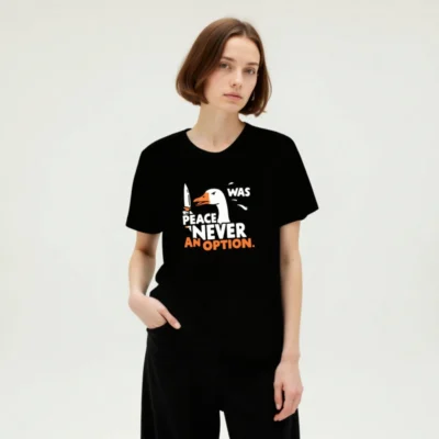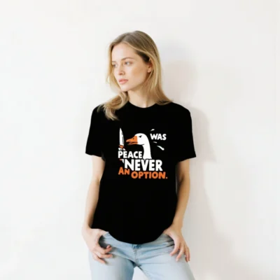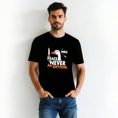 Bold unisex staple t-shirt featuring a striking goose holding a knife with the iconic phrase ‘PEACE WAS NEVER AN OPTION.’ in white and orange. Designed for everyday wear, this graphic tee combines humor and statement-making style. Soft cotton blend, classic fit, versatile for casual or bold looks. Ideal for fans of sharp wit and memorable pop-culture references.
