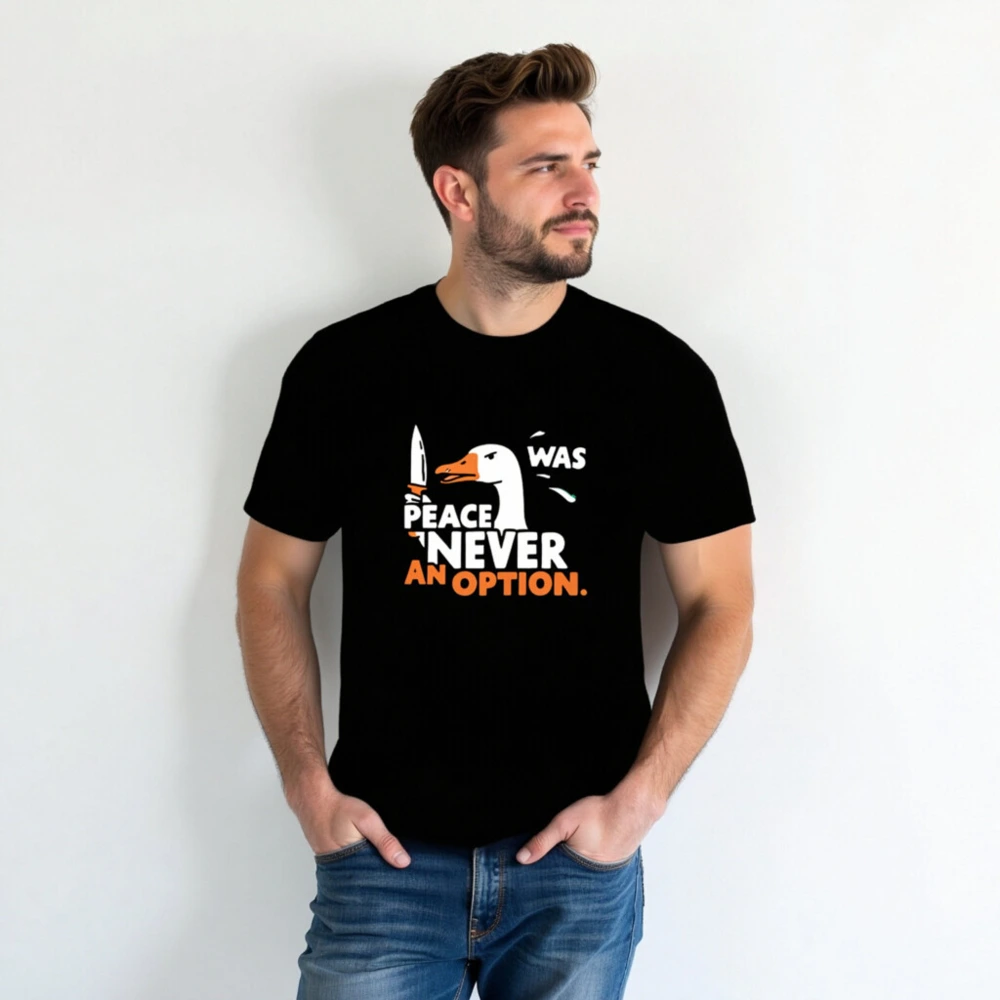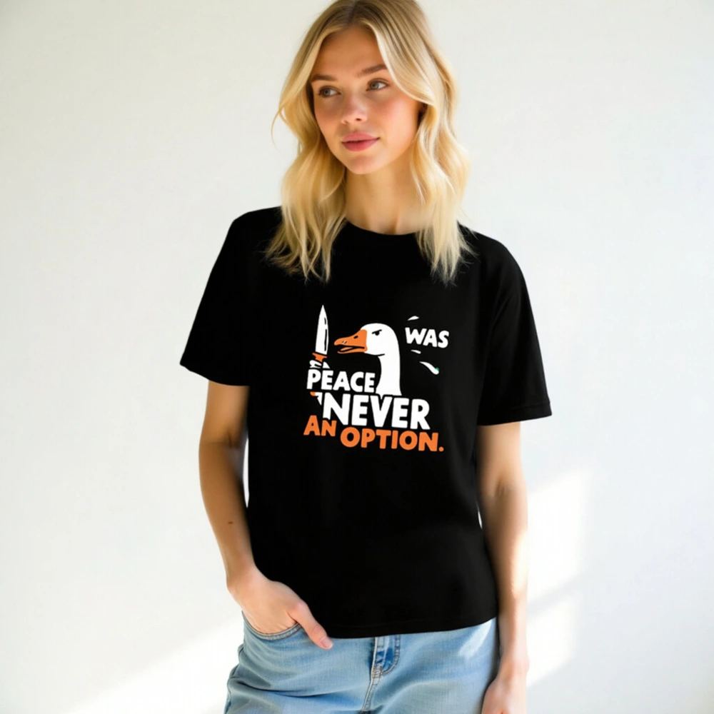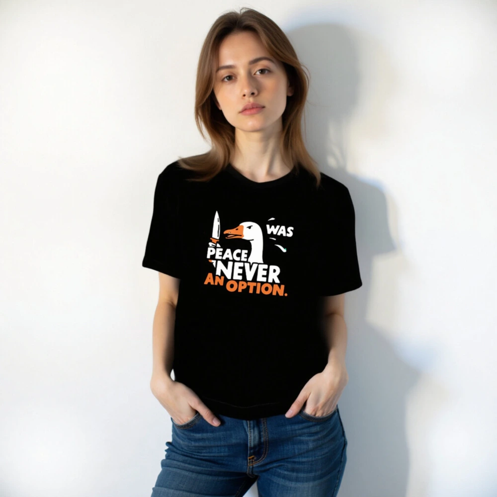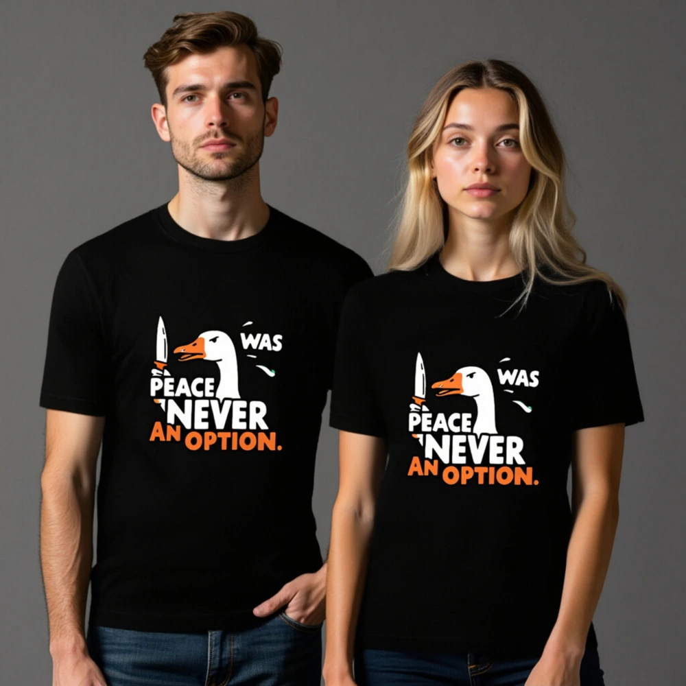 Bold unisex staple t-shirt featuring a striking goose holding a knife with the iconic phrase ‘PEACE WAS NEVER AN OPTION.’ in white and orange. Designed for everyday wear, this graphic tee combines humor and statement-making style. Soft cotton blend, classic fit, versatile for casual or bold looks. Ideal for fans of sharp wit and memorable pop-culture references.