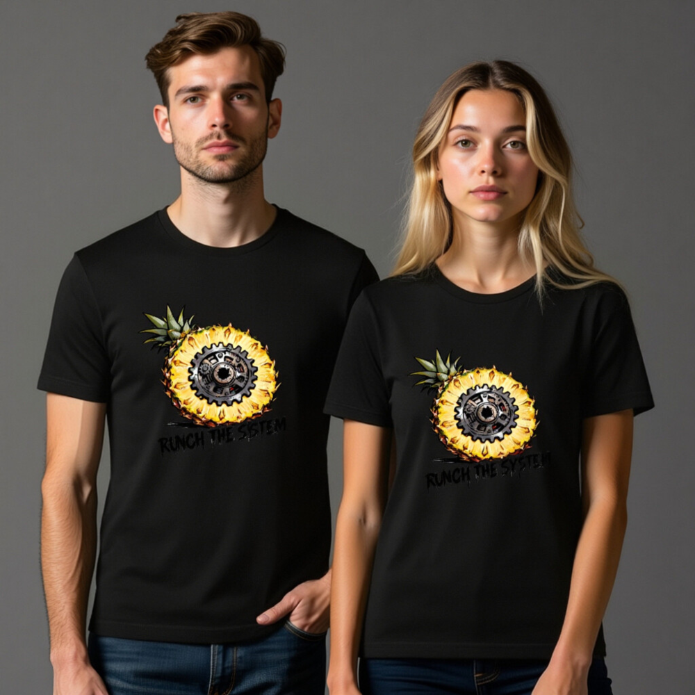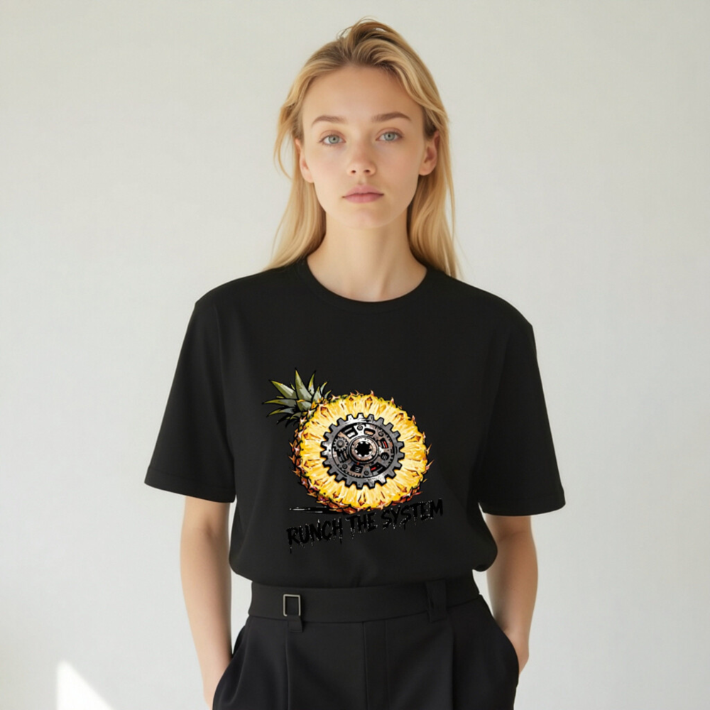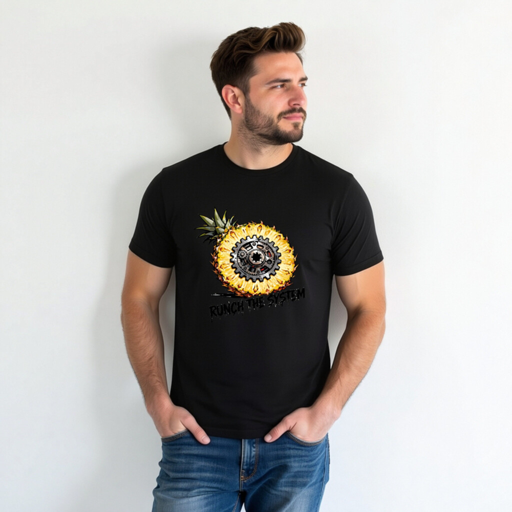 Bold unisex staple t-shirt featuring a striking cross-section pineapple with a mechanical gear at its core, symbolizing ‘Runch the System’—a fusion of organic and industrial aesthetics. Designed for comfort and statement-making style. Classic fit, versatile wear. Ideal for fans of retro-futurism, tech-geek culture, or eco-conscious rebellion. No certifications or claims added beyond what’s visibly presented.