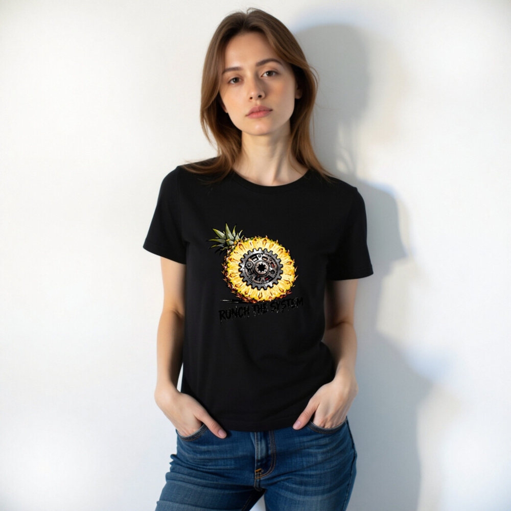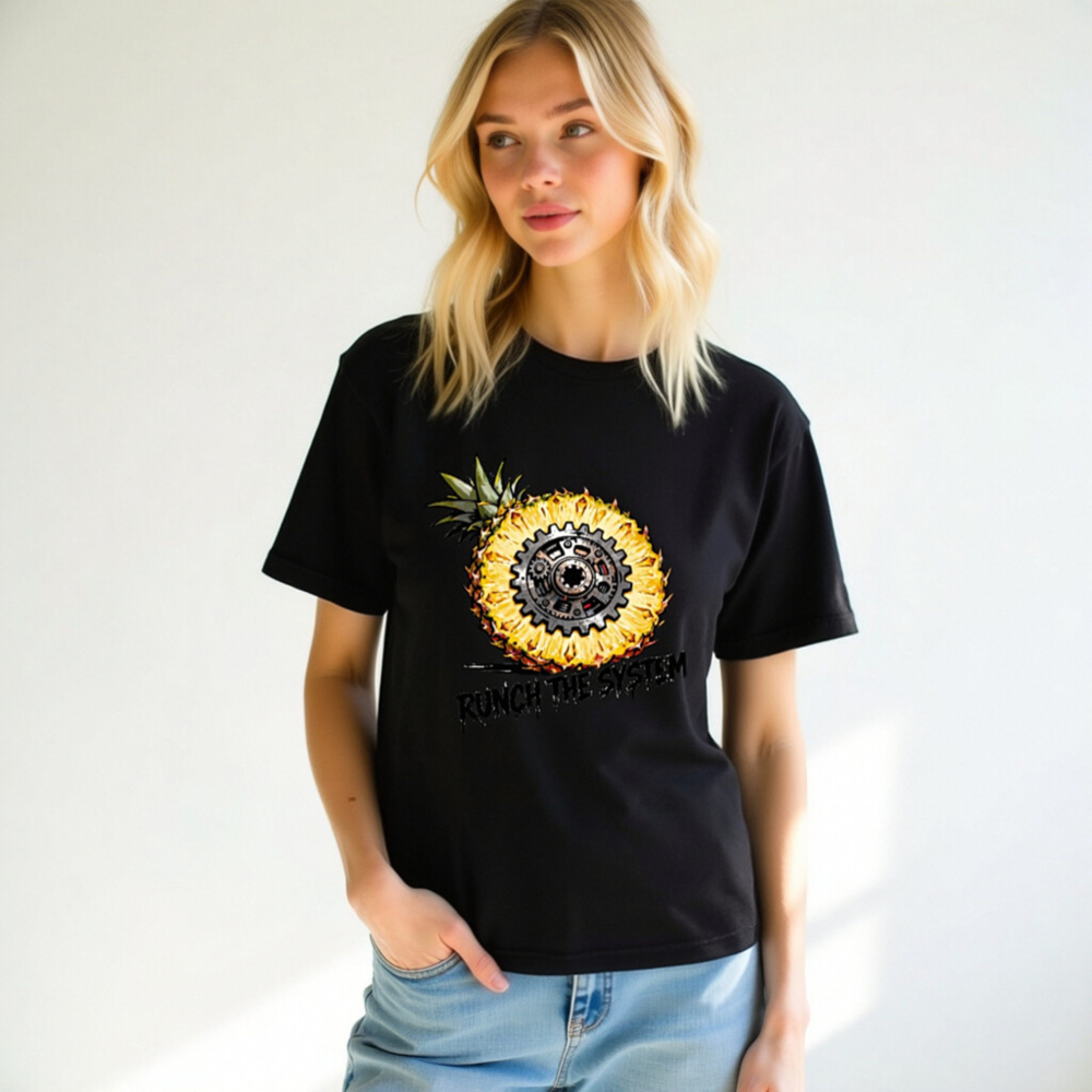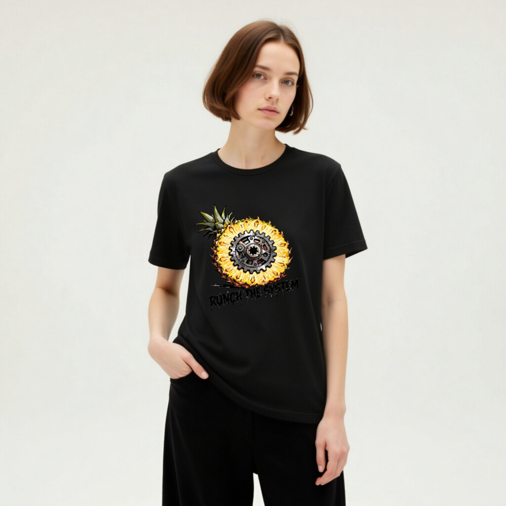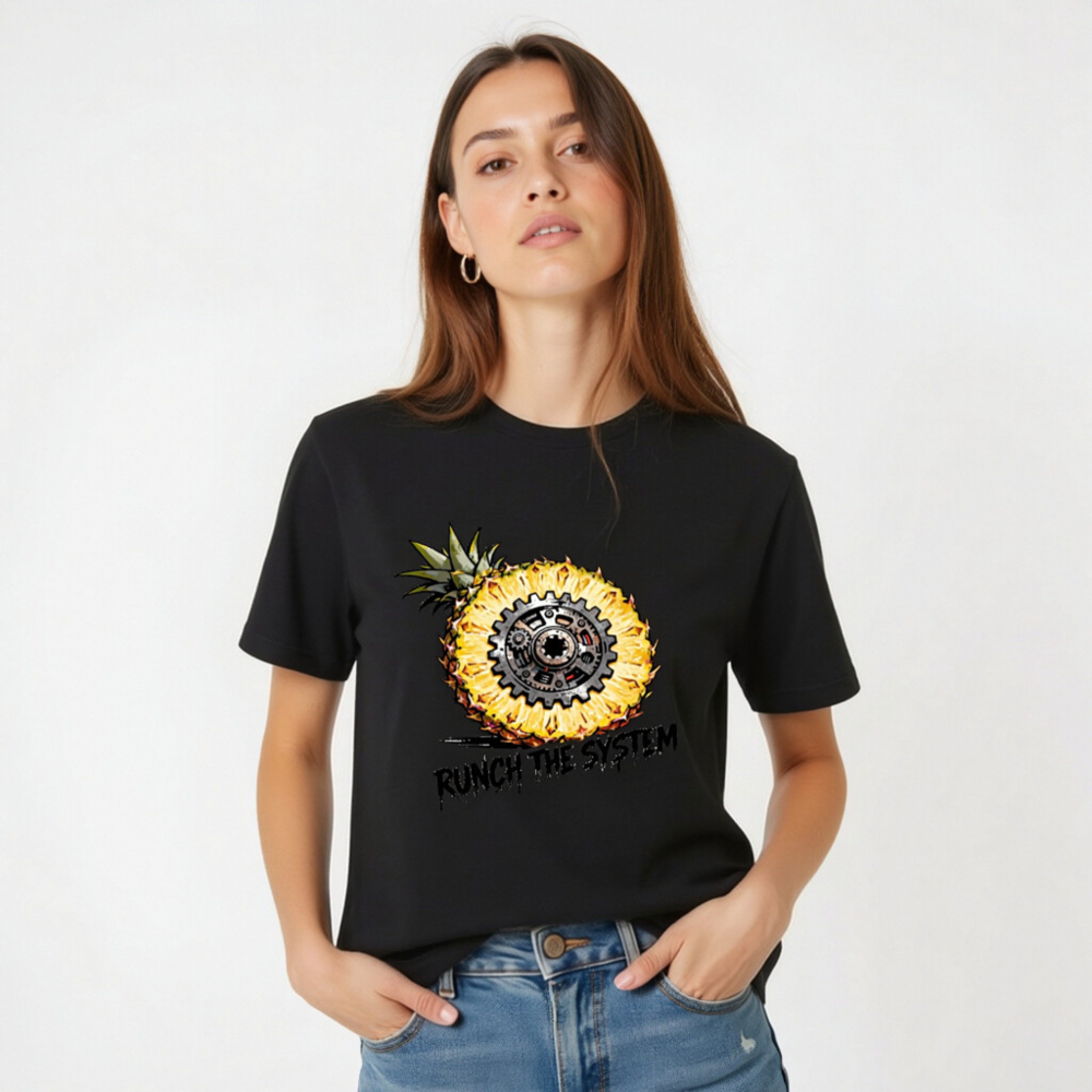 Bold unisex staple t-shirt featuring a striking cross-section pineapple with a mechanical gear at its core, symbolizing ‘Runch the System’—a fusion of organic and industrial aesthetics. Designed for comfort and statement-making style. Classic fit, versatile wear. Ideal for fans of retro-futurism, tech-geek culture, or eco-conscious rebellion. No certifications or claims added beyond what’s visibly presented.