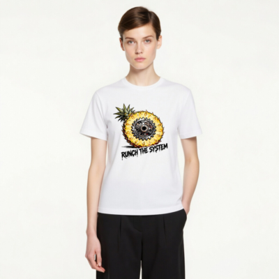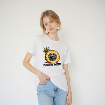This unisex staple t-shirt features a bold, eye-catching design: a sliced pineapple with a mechanical gear at its center, paired with the rebellious slogan ‘RUNCH THE SYSTEM’. Crafted for comfort and style, it’s ideal for everyday wear. The graphic combines natural tropical imagery with industrial aesthetics—perfect for those who appreciate unique, statement-making apparel. Available in classic fit, suitable for all genders.