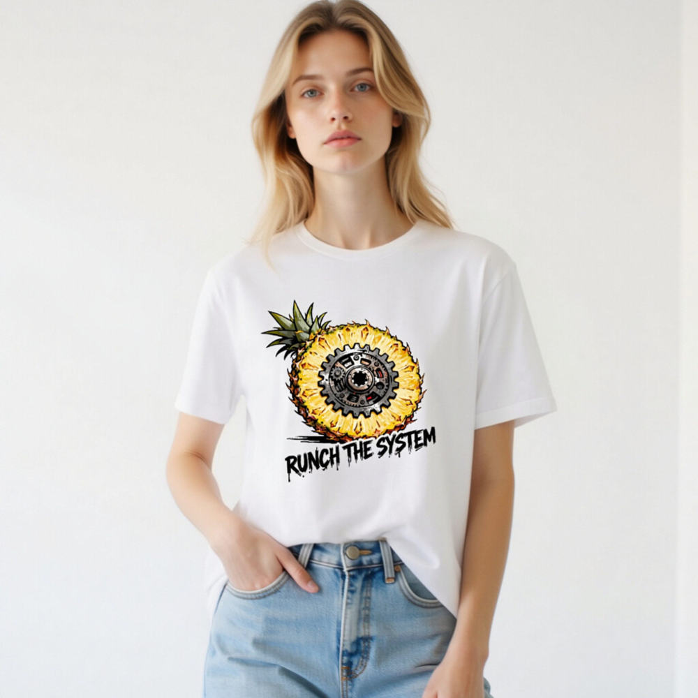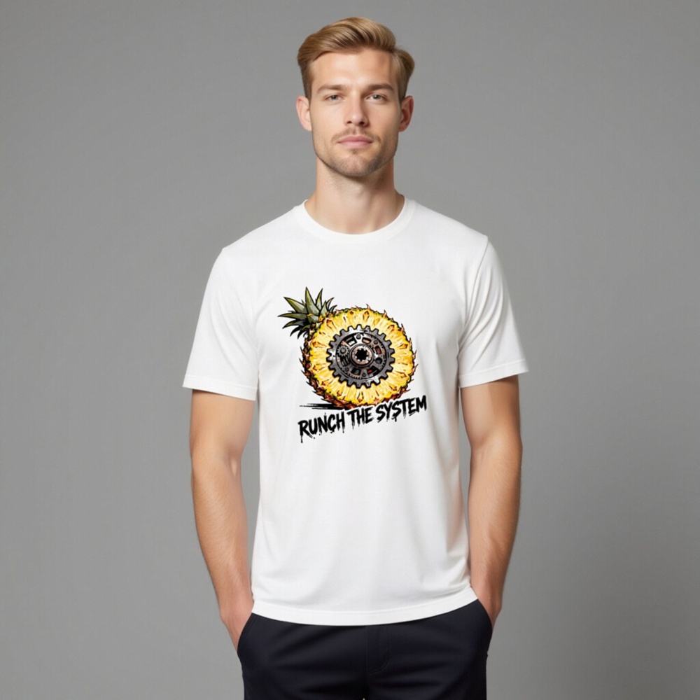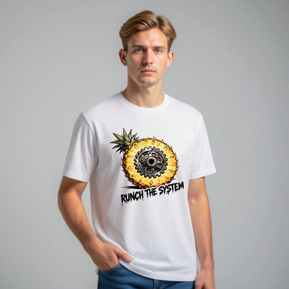 This unisex staple t-shirt features a bold, eye-catching design: a sliced pineapple with a mechanical gear at its center, paired with the rebellious slogan ‘RUNCH THE SYSTEM’. Crafted for comfort and style, it’s ideal for everyday wear. The graphic combines natural tropical imagery with industrial aesthetics—perfect for those who appreciate unique, statement-making apparel. Available in classic fit, suitable for all genders.