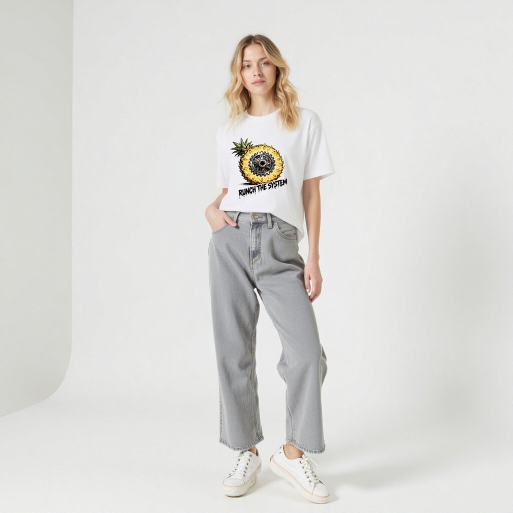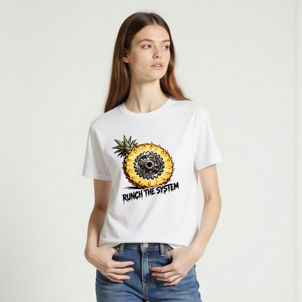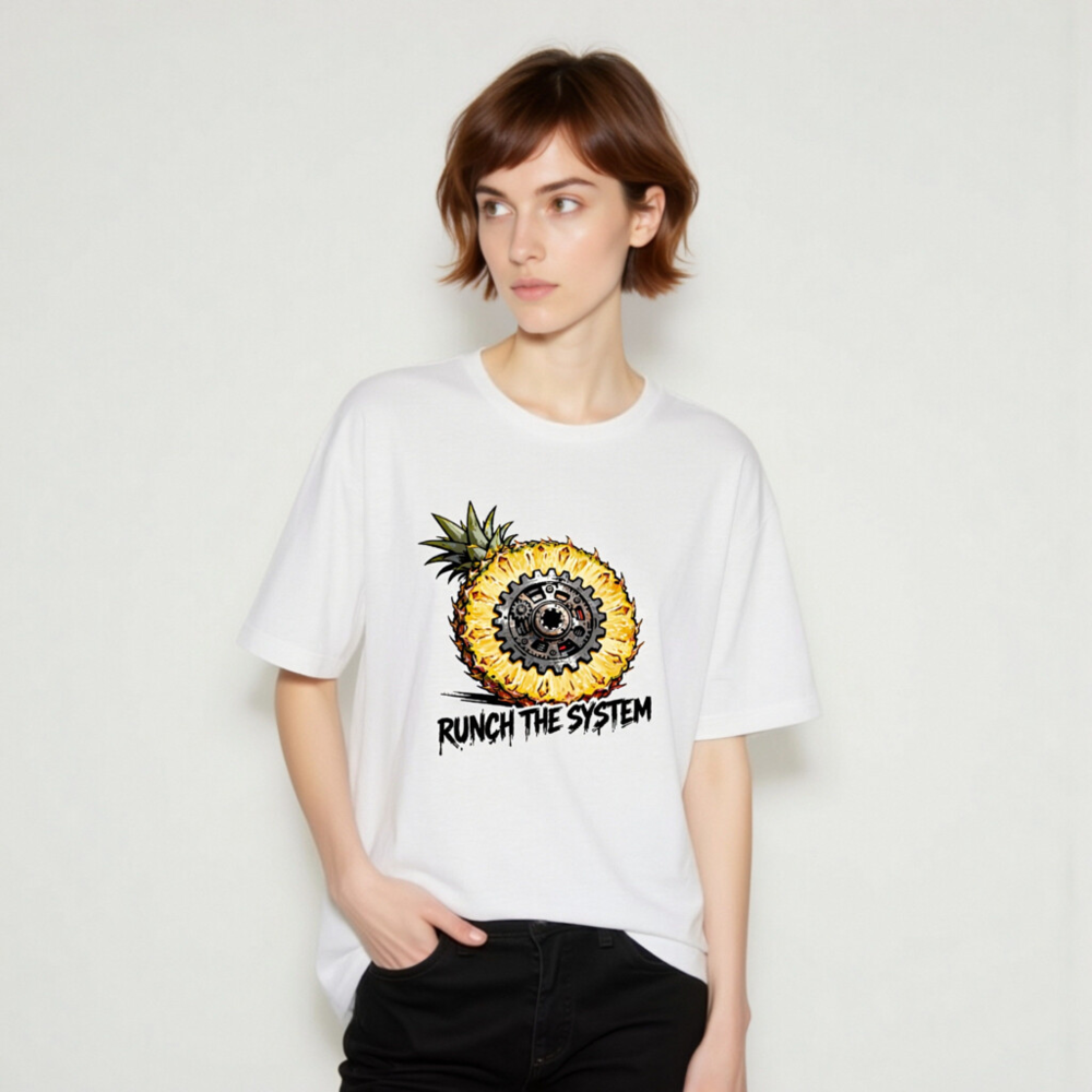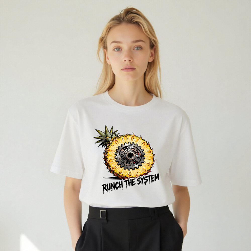 This unisex staple t-shirt features a bold, eye-catching design: a sliced pineapple with a mechanical gear at its center, paired with the rebellious slogan ‘RUNCH THE SYSTEM’. Crafted for comfort and style, it’s ideal for everyday wear. The graphic combines natural tropical imagery with industrial aesthetics—perfect for those who appreciate unique, statement-making apparel. Available in classic fit, suitable for all genders.