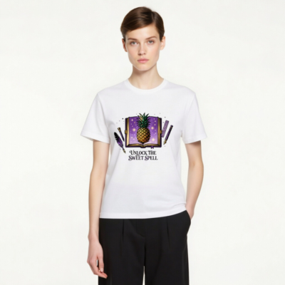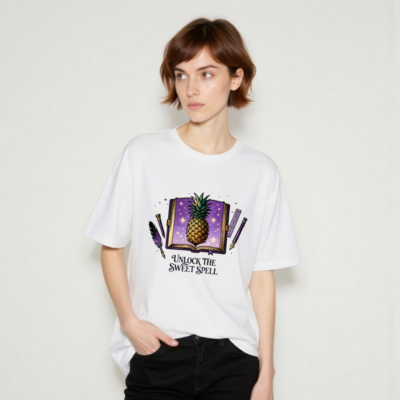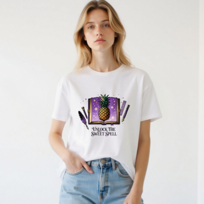 This unisex staple t-shirt features a magical pineapple spellbook design with stars, quills, and a purple parchment theme. The ‘Unlock the Sweet Spell’ slogan adds whimsy and charm. Crafted for comfort and everyday wear, it’s perfect for fans of fantasy, food lovers, and those who appreciate quirky, uplifting fashion. Ideal for casual outings or as a fun gift.