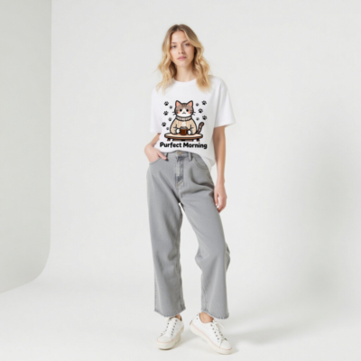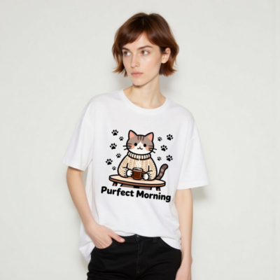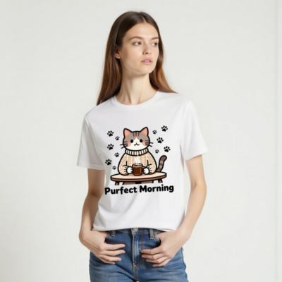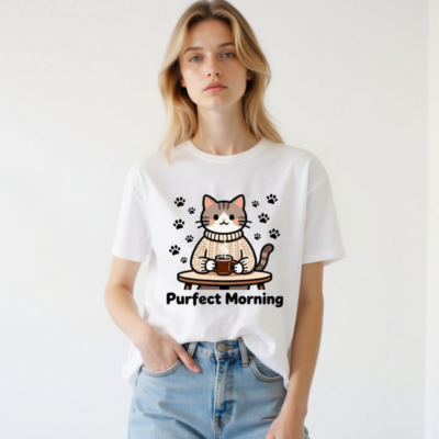 Cozy unisex staple t-shirt featuring a charming tabby cat in a knitted sweater, sipping steaming coffee at a tiny table—surrounded by playful paw prints. Soft, comfortable, and perfect for casual wear. ‘Purfect Morning’ slogan adds whimsy. Ideal for cat lovers seeking cute, everyday apparel. Made for all genders, classic fit, versatile style.