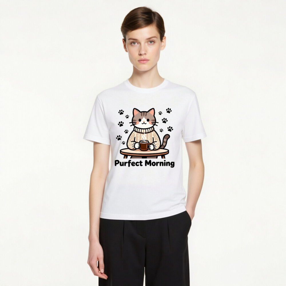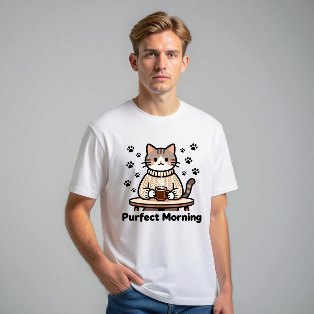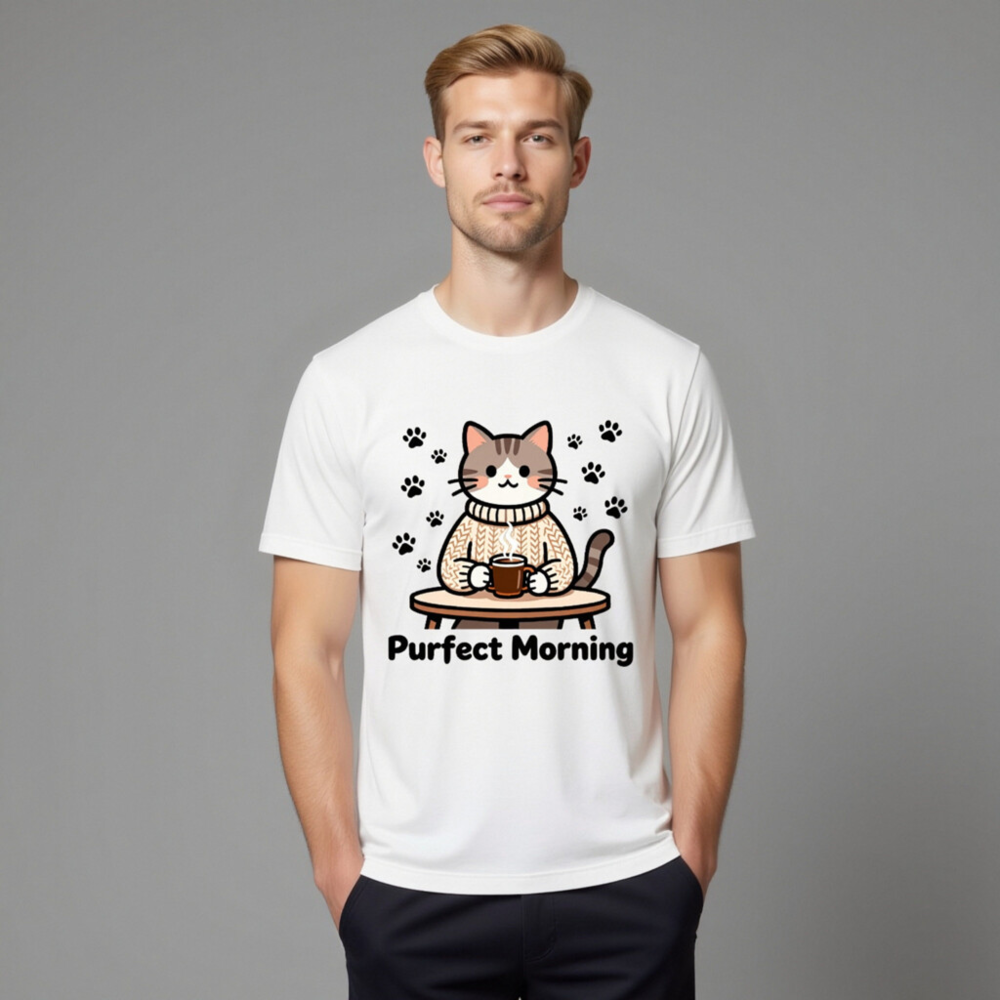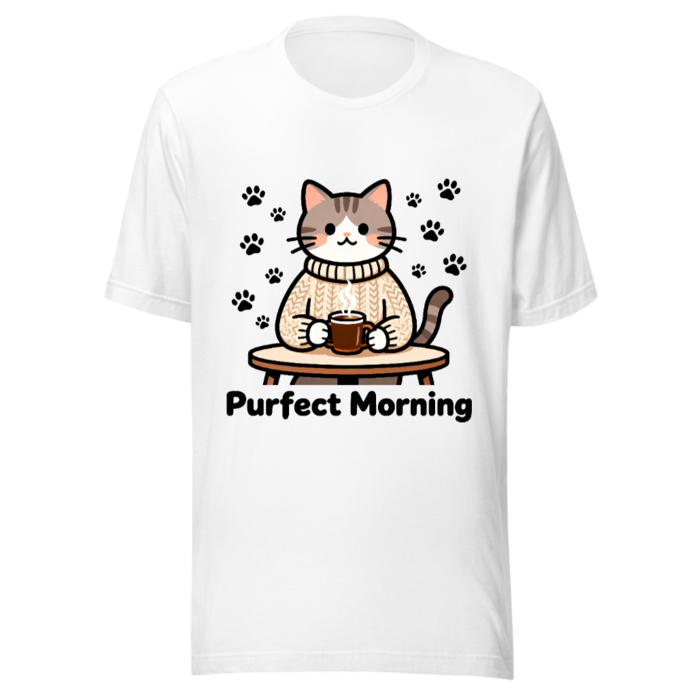 Cozy unisex staple t-shirt featuring a charming tabby cat in a knitted sweater, sipping steaming coffee at a tiny table—surrounded by playful paw prints. Soft, comfortable, and perfect for casual wear. ‘Purfect Morning’ slogan adds whimsy. Ideal for cat lovers seeking cute, everyday apparel. Made for all genders, classic fit, versatile style.