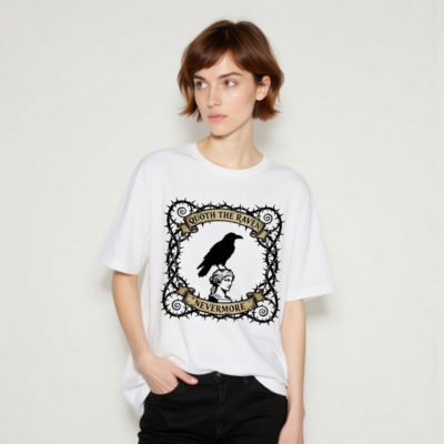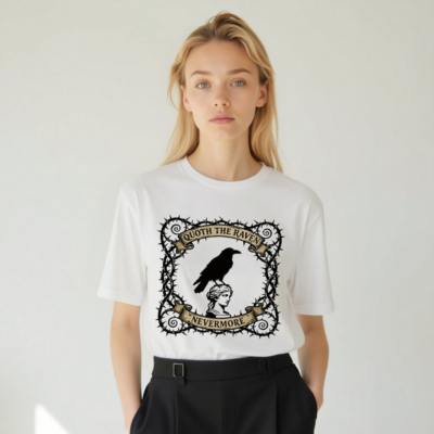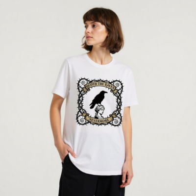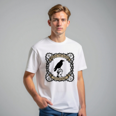 A unisex staple t-shirt featuring a striking gothic design: a raven perched atop a classical bust, framed by thorny vines and vintage banners reading ‘Quoth the Raven’ and ‘Nevermore’. Made for comfort and style, this classic fit tee captures Poe-inspired mystique. Ideal for literary fans, goth lovers, and everyday wear. Soft cotton blend, machine washable.