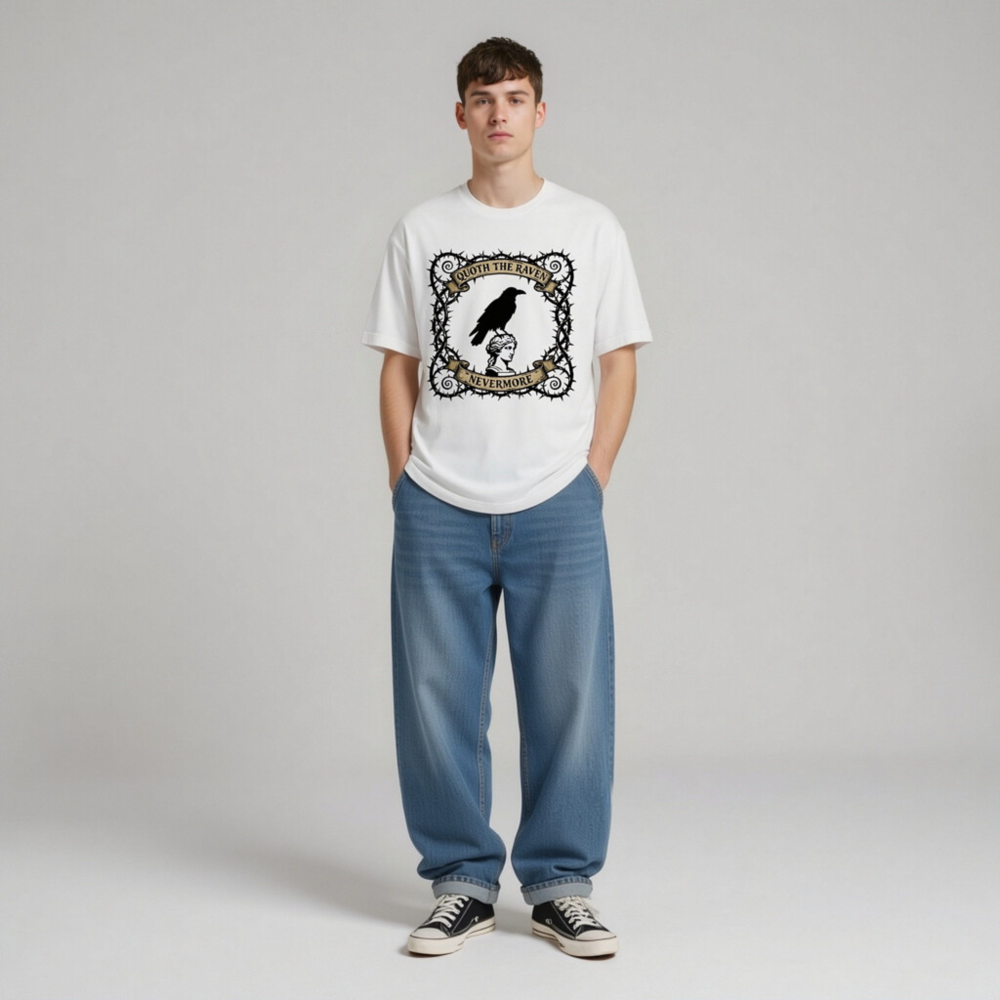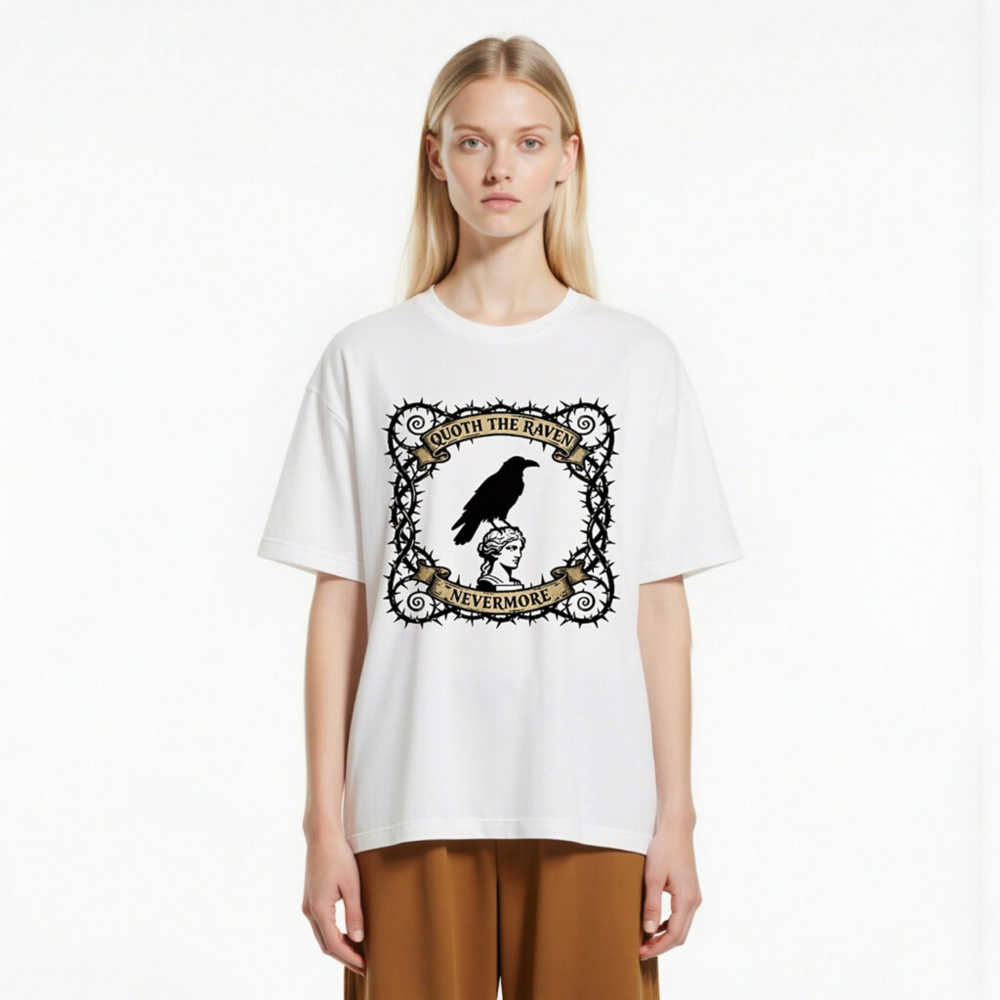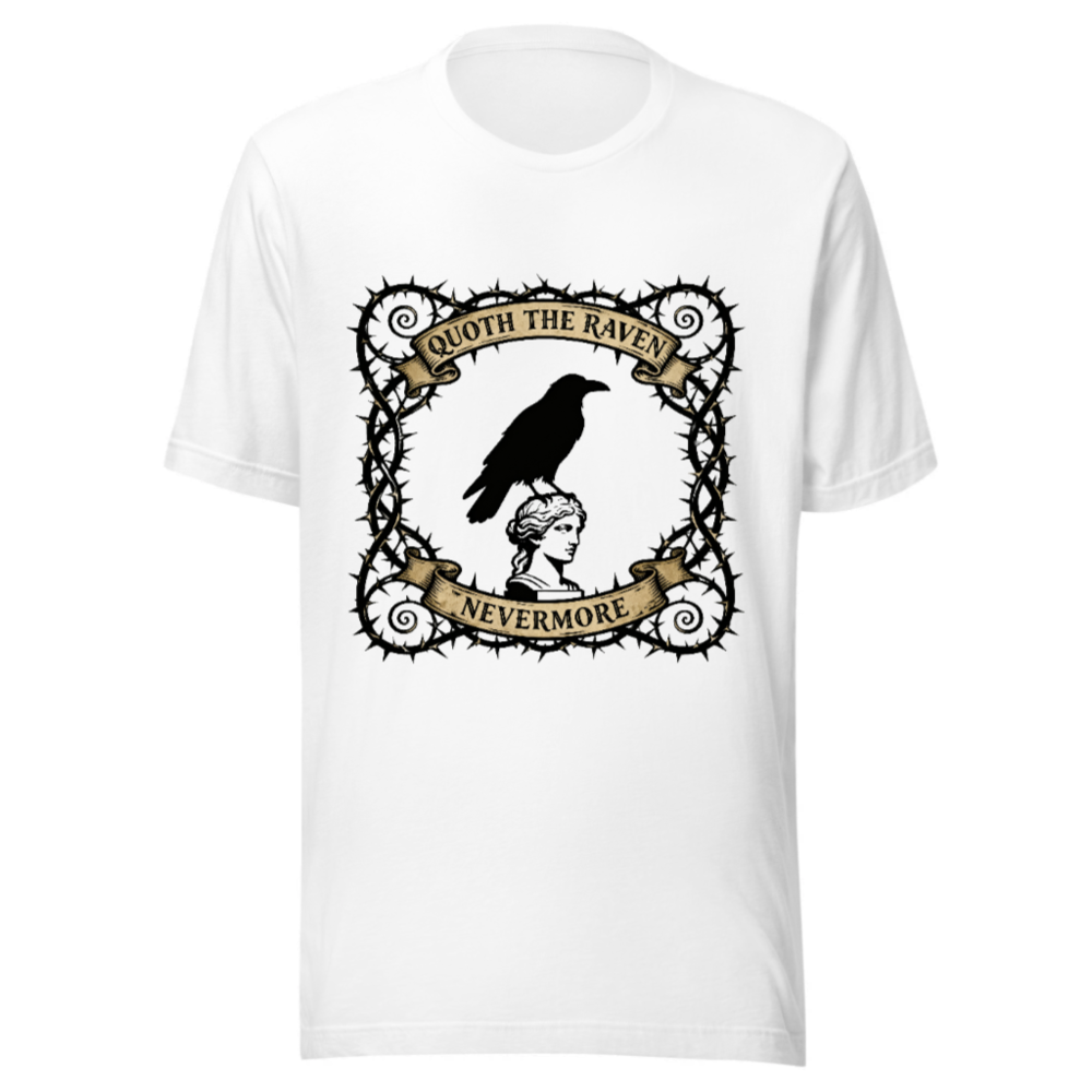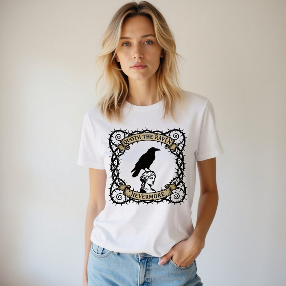 A unisex staple t-shirt featuring a striking gothic design: a raven perched atop a classical bust, framed by thorny vines and vintage banners reading ‘Quoth the Raven’ and ‘Nevermore’. Made for comfort and style, this classic fit tee captures Poe-inspired mystique. Ideal for literary fans, goth lovers, and everyday wear. Soft cotton blend, machine washable.
