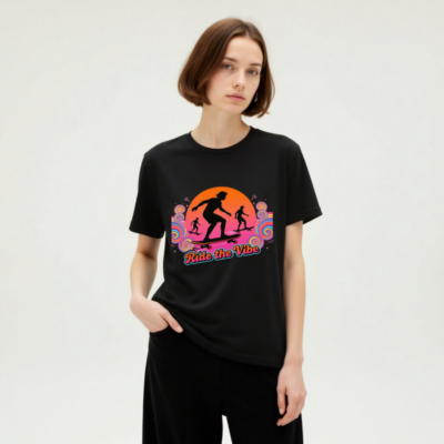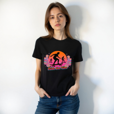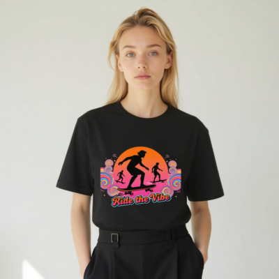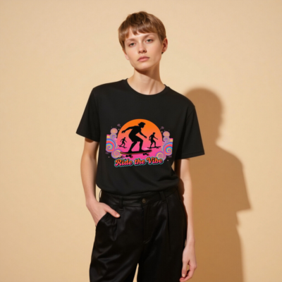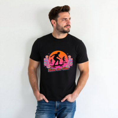 This unisex staple t-shirt features a vibrant ‘Ride the Vibe’ skateboard graphic with retro swirls and sunset hues. Designed for comfort and style, it’s a versatile black tee perfect for casual wear. The bold silhouette design captures skate culture energy—ideal for fans of vintage aesthetics and active lifestyles. Durable, everyday wear for all.